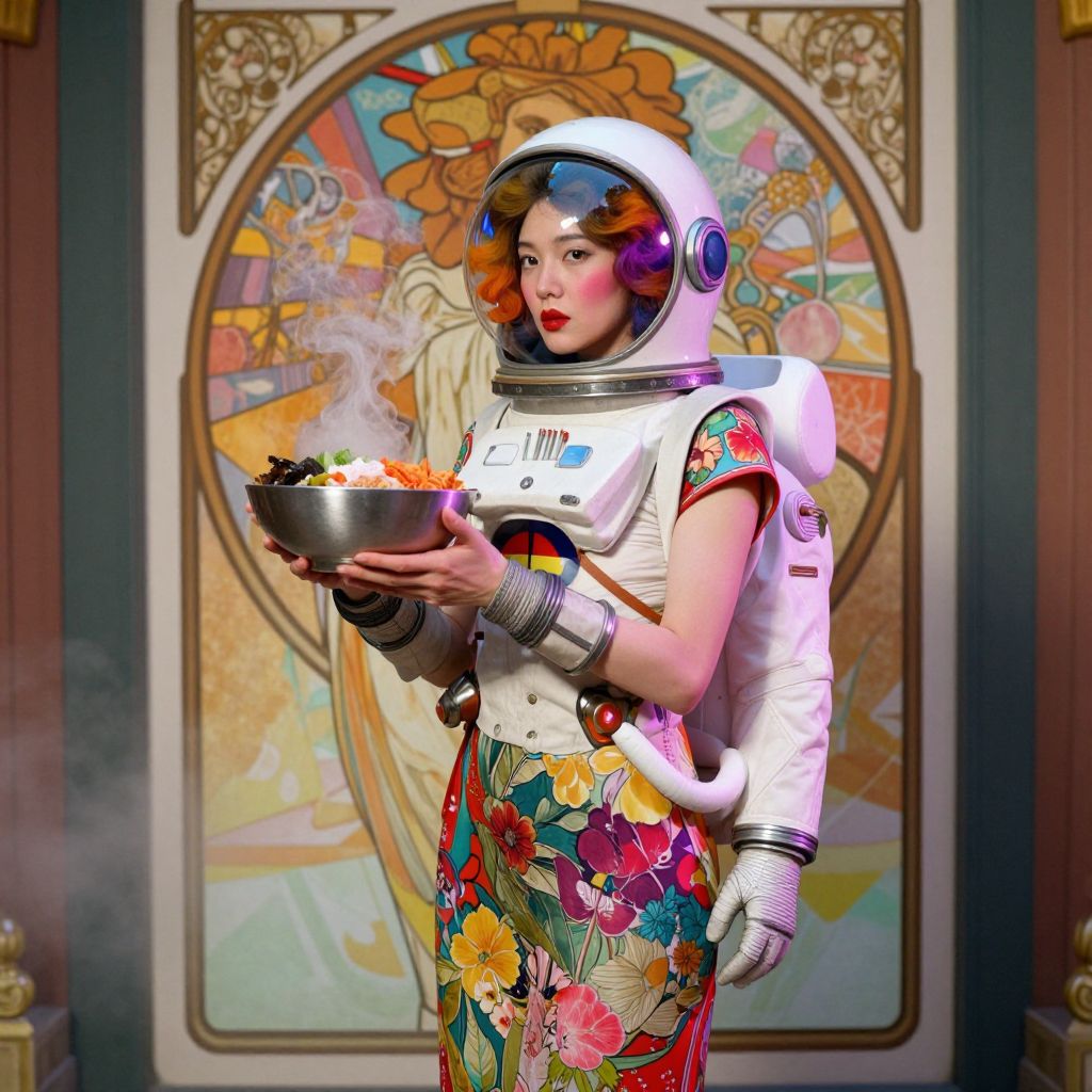 The image presents a striking scene that blends elements of Alphonse Mucha's Art Nouveau style with the whimsical, psychedelic aesthetic of Wes Anderson. Set outdoors, the scene is shot in a photorealistic manner, capturing the intricate details of the subjects and their surroundings. A thin female model, possibly of Chinese descent, is the focal point, holding a steaming bowl of Korean food, which adds a vibrant splash of color to the composition. She is dressed in a long floral Cheongsam, a traditional Chinese garment, complemented by a South Korean inspired spacesuit and a dome glass helmet, creating a retro-futuristic atmosphere reminiscent of Shanghai. Her pale skin, red lips, and rosy cheeks stand out against the vivid background. The random hair style and color, along with the random color tint in shadows, add to the eclectic and dynamic feel of the scene. The haze and random color backlighting enhance the dreamlike quality, while the 12mm lens perspective adds depth and dimension. The overall composition is powerful and epic, with elements arranged in a way that creates a sense of movement and energy, evoking a fantastical, superhero-like atmosphere.