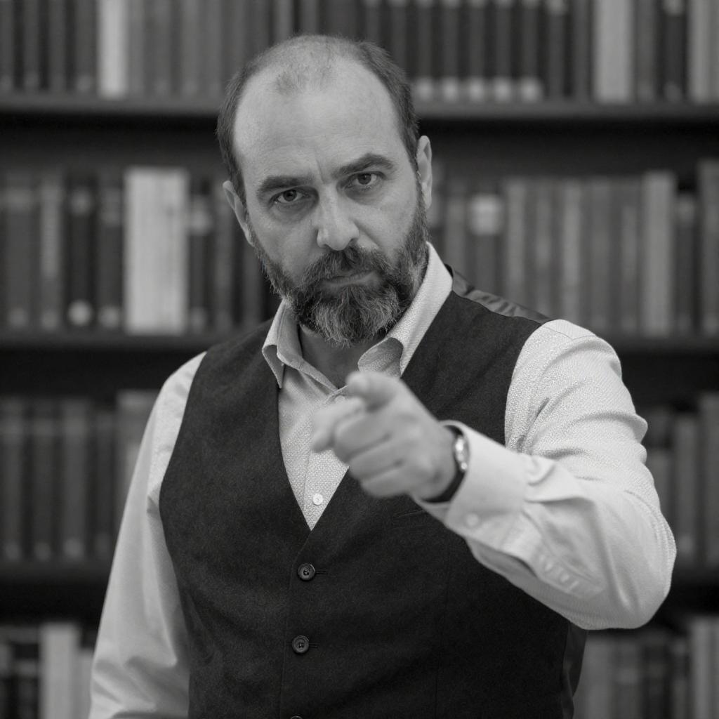Black-and-white photograph of a middle-aged man with thinning hair, wearing a ured white shirt, looking intently to the side. He holds a camera with gloved hands, positioned in the lower foreground. The background is dark, with horizontal lines crossing the image. The man's expression is focused and serious.
