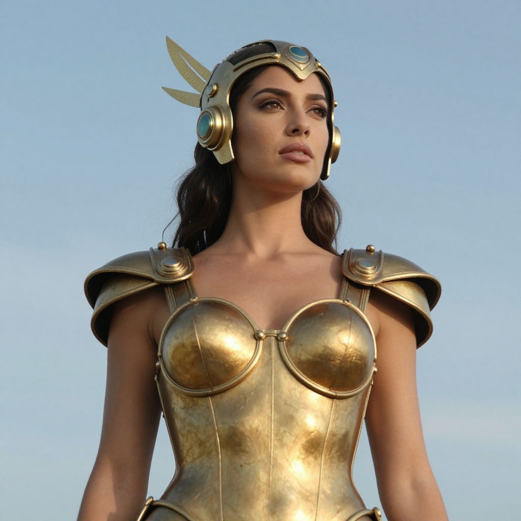 Photograph of a woman with long, dark brown hair, wearing a gold, metallic, ancient Greek-style armor with winged shoulder guards and a round breastplate. She also has a gold helmet with winged accents. Her skin is tan, and she has a focused expression. The background is a clear, bright blue sky. The armor has a polished, reflective surface, and her overall appearance conveys strength and determination. The image is well-lit, highlighting the golden texture of her armor against the blue sky.