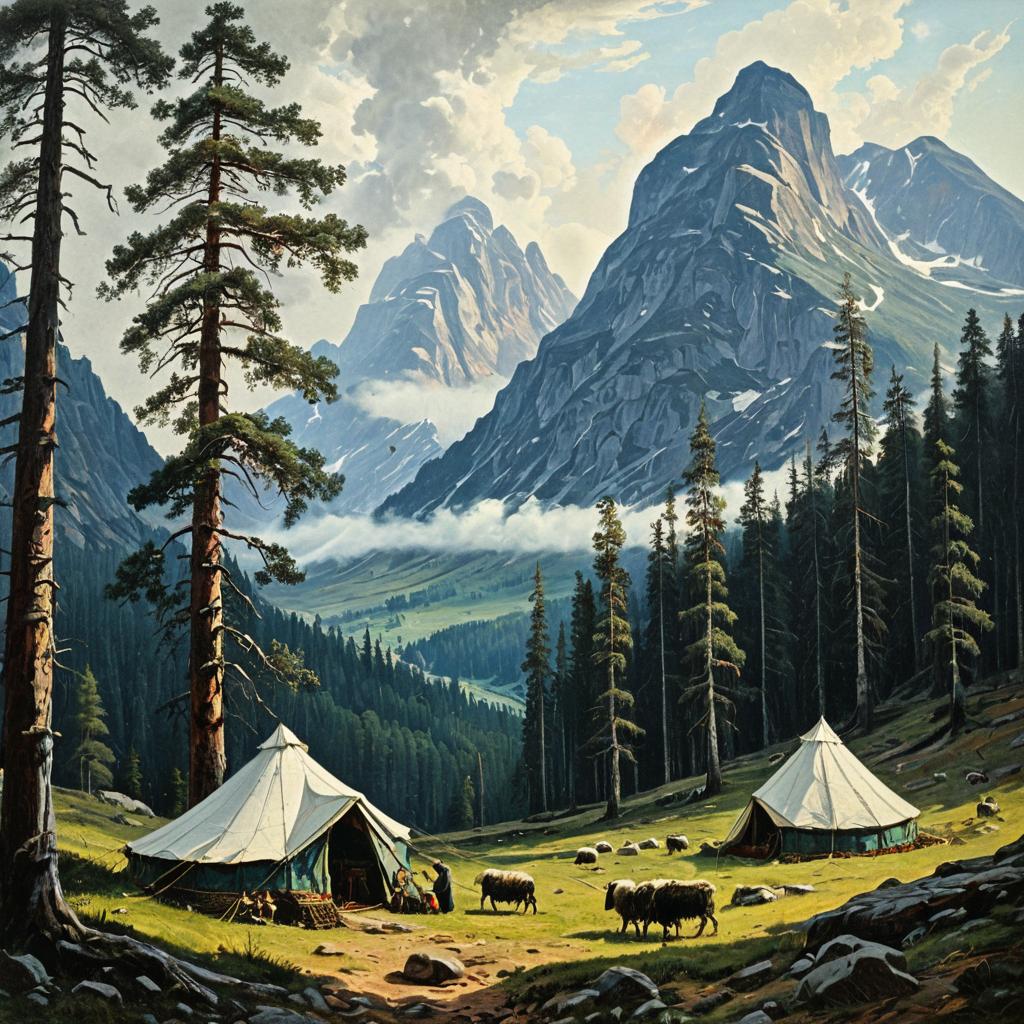 Painting of a mountain plateau featuring towering peaks and dense forest. Two shepherd's tents are pitched near tall pine trees. Several sheep graze on a sunlit grassy clearing surrounded by a coniferous forest. The sky is partly cloudy with soft haze. The style is inspired by Russian symbolism and Slavic folk art.