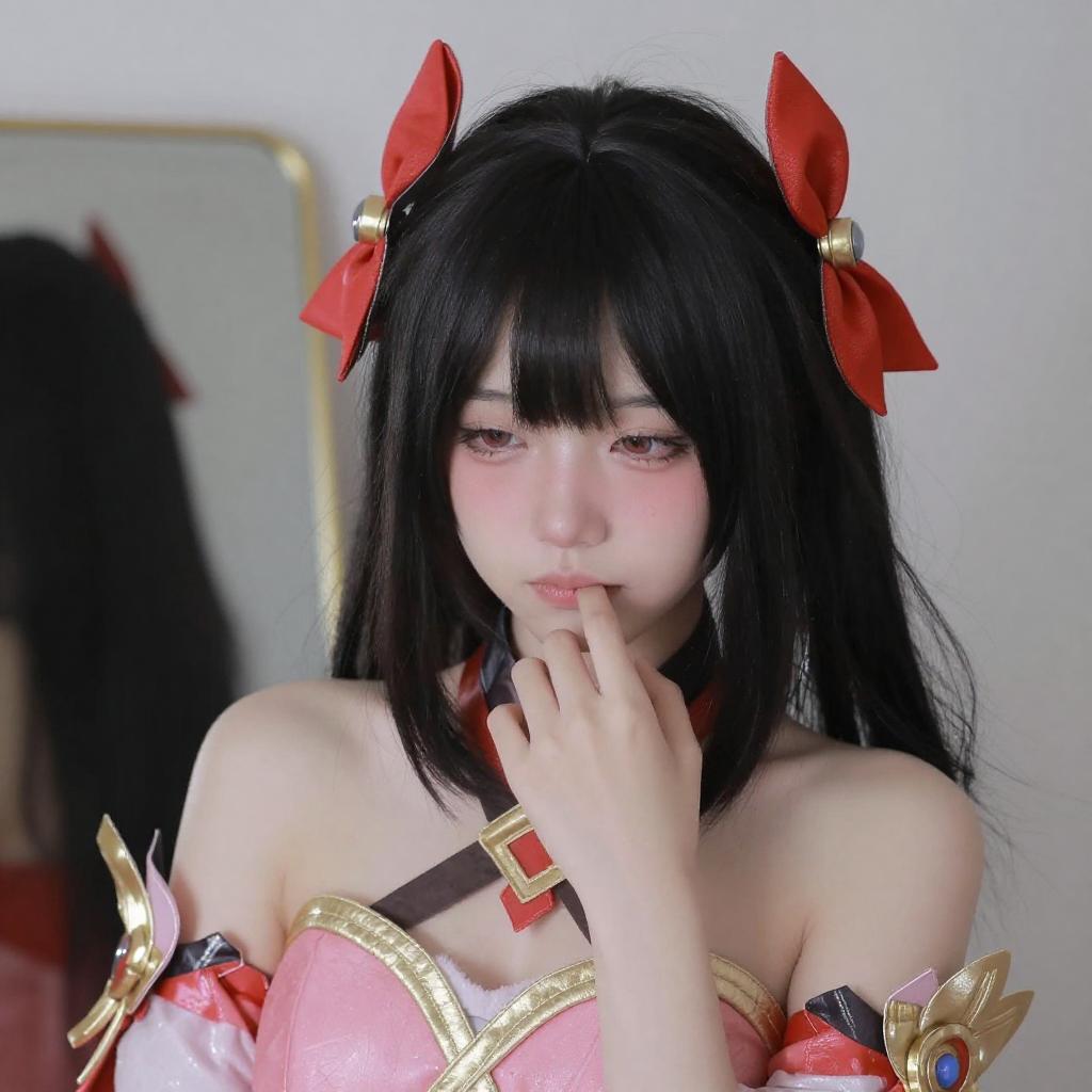 Photograph of an Asian woman with long black hair and red bows, wearing a red and gold cosplay outfit with a deep neckline, blue ribbon, and gold accents. She is sitting, making a peace sign with both hands, smiling with closed eyes. Background includes a mirror and dark walls.