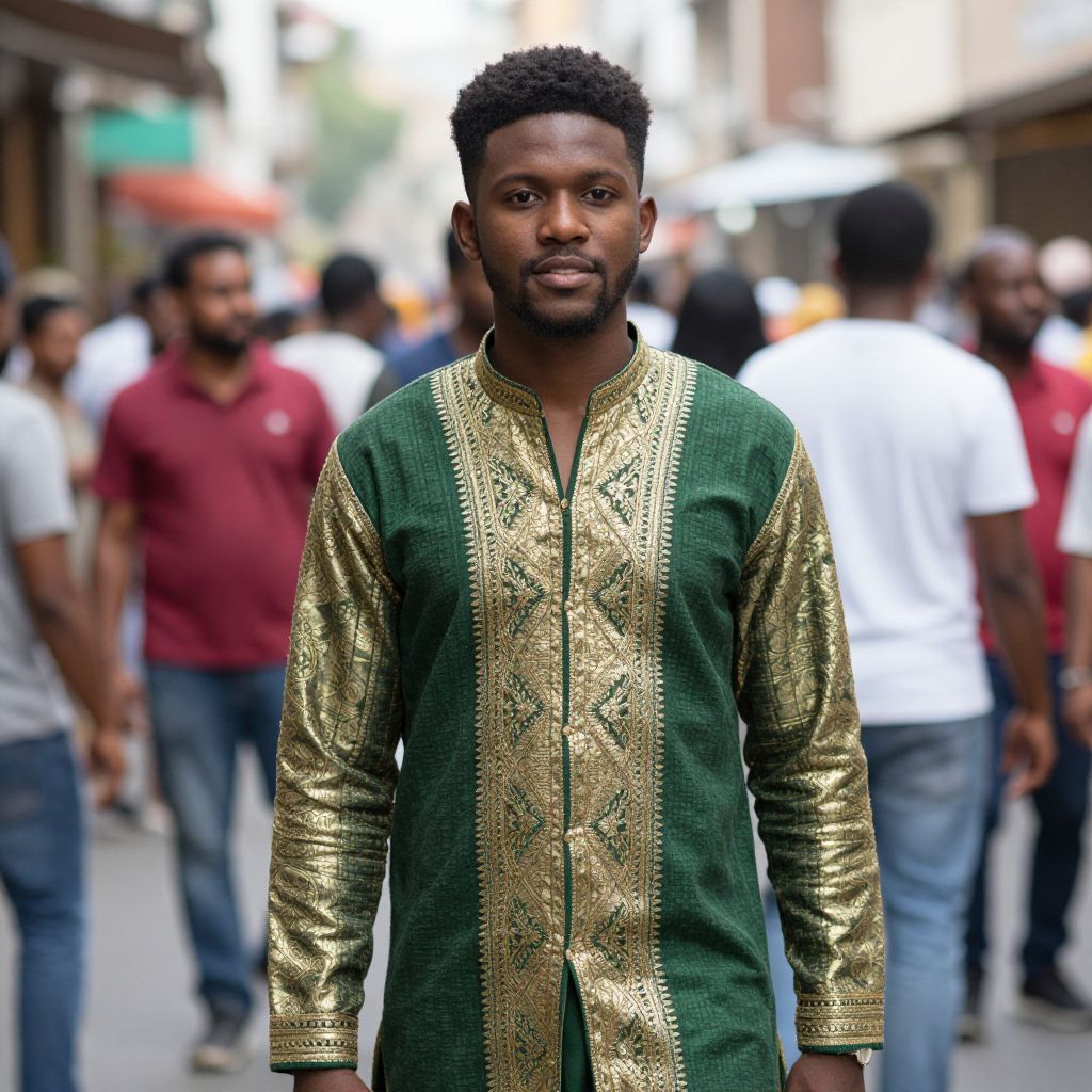 Gere Pretty, man in a green and gold outfit standing in a crowded street