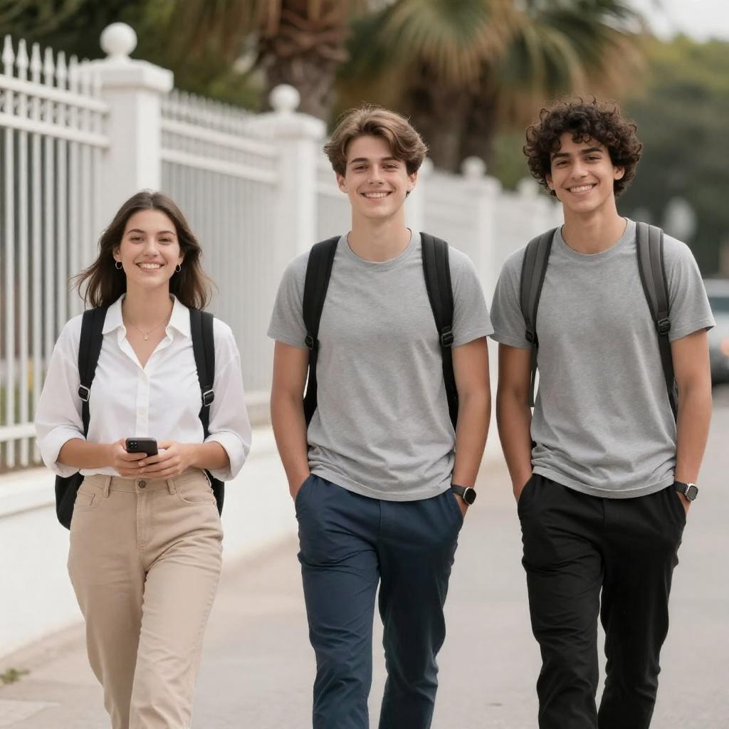 Photograph of three young people walking outdoors. Two males and one female, all smiling. Female on left with brown hair, white shirt, and beige pants, holding phone. Male in center with short brown hair, gray shirt, and blue pants, backpack on. Male on right with curly brown hair, gray shirt, black pants, backpack on. White iron fence, palm trees, and greenery in background. All standing close, hands in pockets or by sides. Casual, friendly atmosphere.