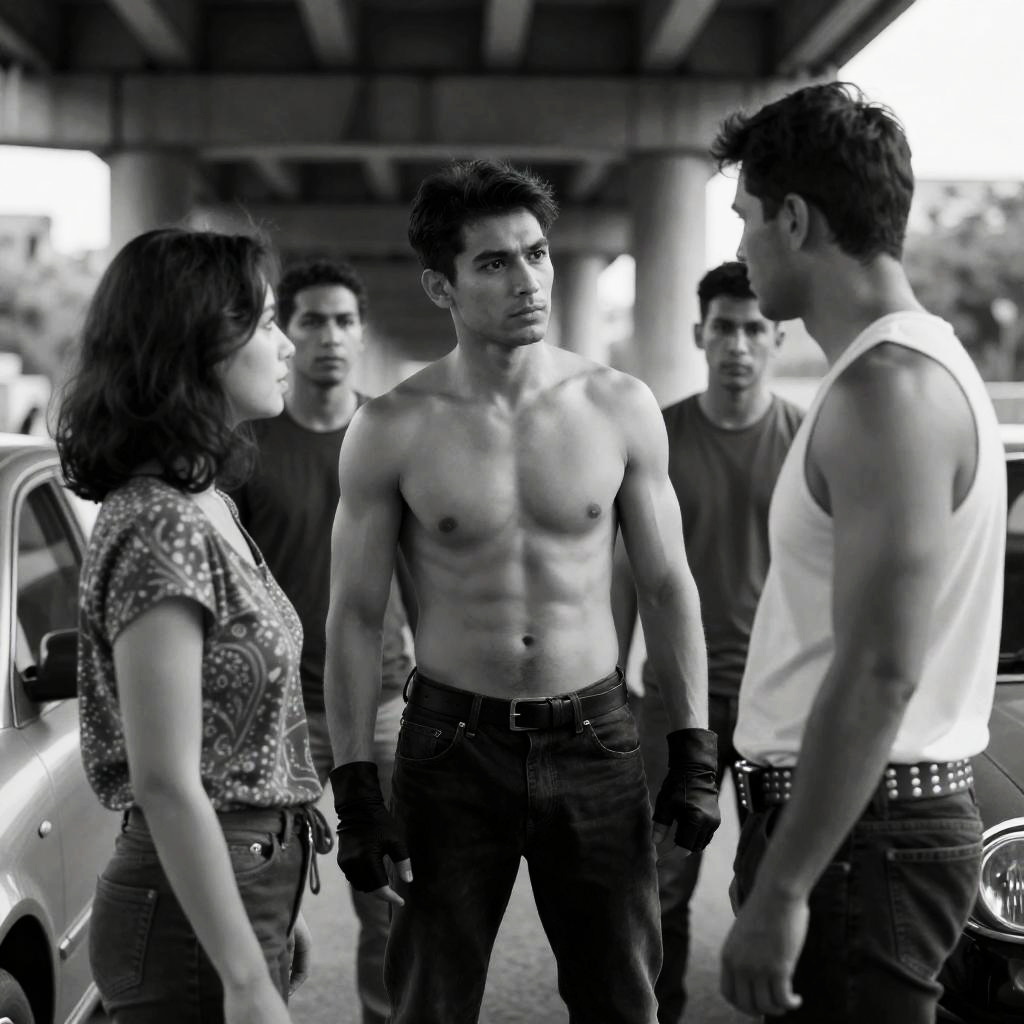 Black and white photograph of five people under a bridge. Shirtless man in center with muscular build, dark pants, and fingerless gloves, interacts with man on right in sleeveless shirt and studded belt. Woman on left wears patterned blouse. Two men in background. Car partially visible on left, metallic object on right. Intense expressions.