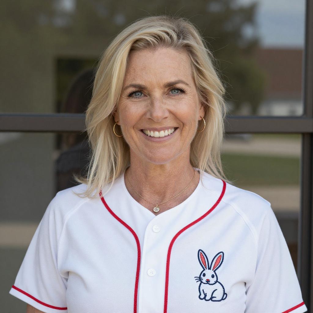 Photograph of a smiling woman with shoulder-length, platinum blonde hair and blue eyes. She's wearing a white baseball-style shirt with red trim and a small embroidered rabbit graphic on the left chest. She has gold hoop earrings and a delicate necklace with a small pendant. The background is softly blurred, showing a window and some greenery outside. The lighting is natural, giving a warm, friendly vibe.