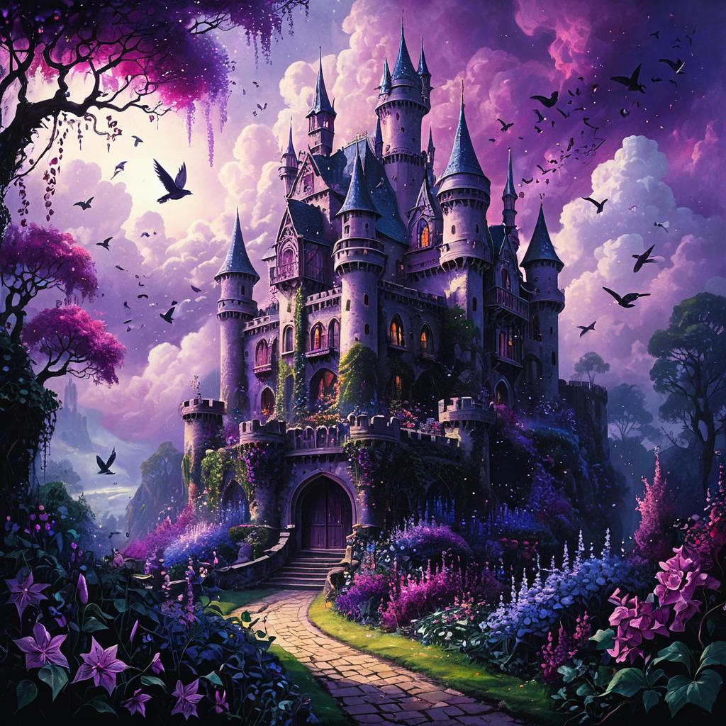 A painting of a castle surrounded by glowing mushrooms, fantasy art, beautiful fantasy painting, fairytale painting, whimsical fantasy landscape art