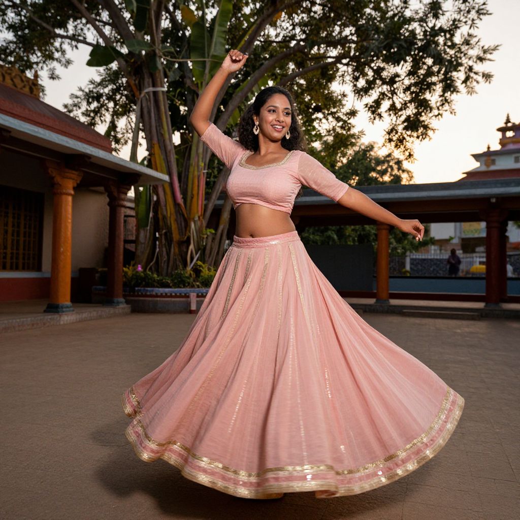 A graceful woman with rich brown skin, a bold smile, and natural makeup wearing a blush-pink lehenga suit with subtle gold borders and a fitted bodice, dancing in a traditional garba circle in a village temple courtyard at sunset, with traditional wooden pillars and a colorful banyan tree in the background.. The woman has big tits and cute face