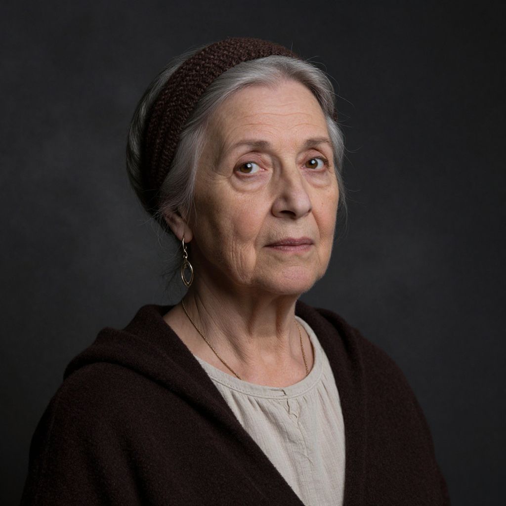Photograph of an elderly woman with gray hair, wearing a dark headscarf, black cardigan, and white blouse, against a dark background.