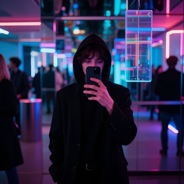 A photograph of a young person with pale skin and dark, shaggy hair wearing a black hooded coat, standing in a brightly lit, futuristic urban environment. They are holding a smartphone in front of their face, partially obscuring their features. Neon blue and pink lights illuminate the background, reflecting off glass walls and creating a vibrant, cyberpunk atmosphere. A glowing, neon blue and pink geometric light fixture hangs in the upper right. Blurred figures of other people are visible in the background, adding depth to the scene. The overall style is modern and edgy.