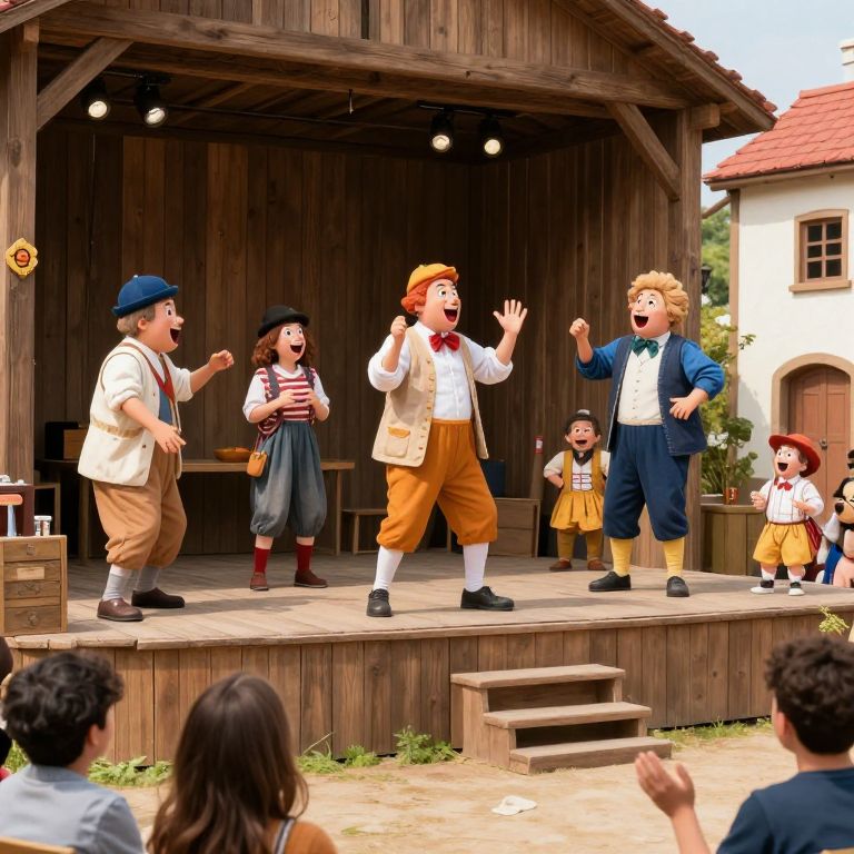 Farce comedy performance on a small village stage, actors with oversized props and exaggerated gestures, funny mishaps happening simultaneously, bright daylight, rustic wooden set, joyful audience laughing, energetic and playful atmosphere, whimsical illustration style.