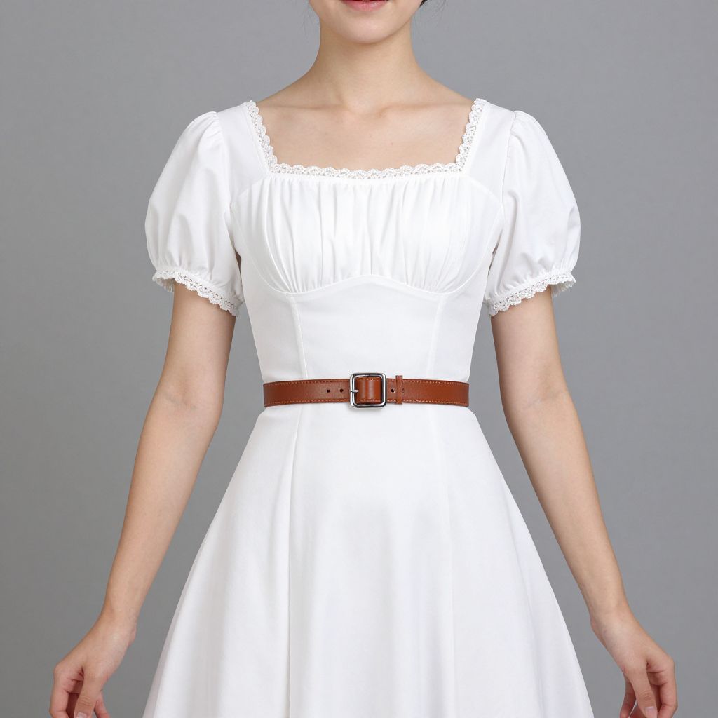 Photograph of a woman from the neck down, wearing a white, short-sleeved, square-neck dress with delicate lace trim on the sleeves and neckline. The dress has a fitted waist, accentuated by a brown leather belt with a silver buckle. The woman's skin is light, and she stands against a plain gray background. Her arms are relaxed by her sides. The dress is made of a light, slightly textured fabric, and the overall style is simple and classic.