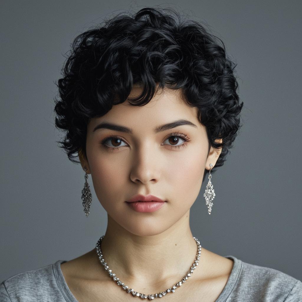 Portrait of Woman with Gray Curly Pixie Cut and Jewelry
