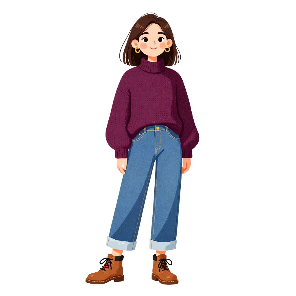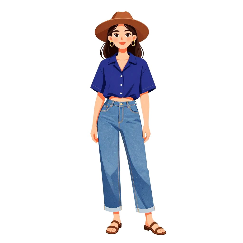 Digital illustration of a cute, young woman with brown hair, wearing a black bucket hat, striped sweater, high-waisted blue jeans, black belt