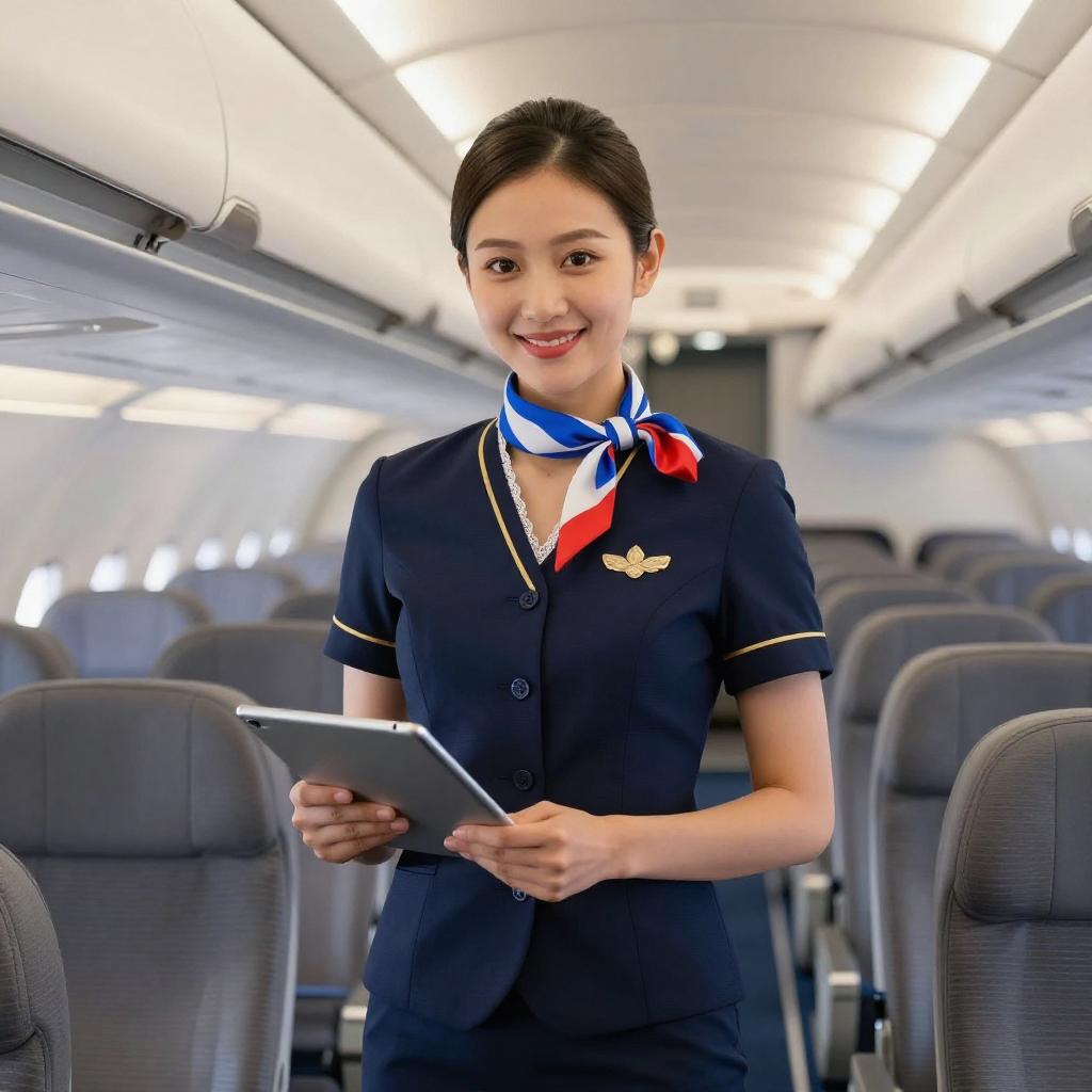 Photograph of an attractive Asian woman with fair skin and dark hair in an airplane cabin. She's wearing a navy blue flight attendant uniform with a white lace-trimmed neckline, a colorful blue, white, and red bow tie, and holding a tablet. She has a friendly smile and is standing in front of rows of gray seats with a bright overhead light in the background.