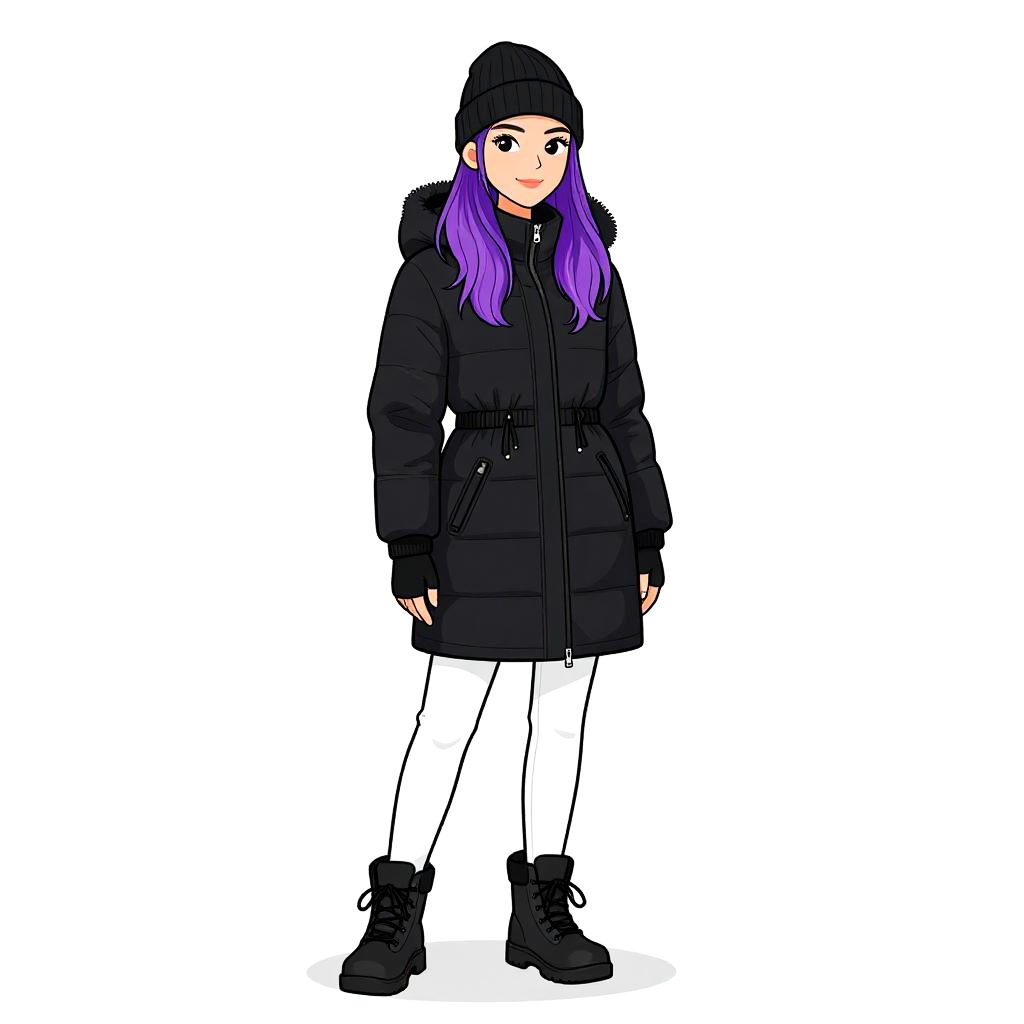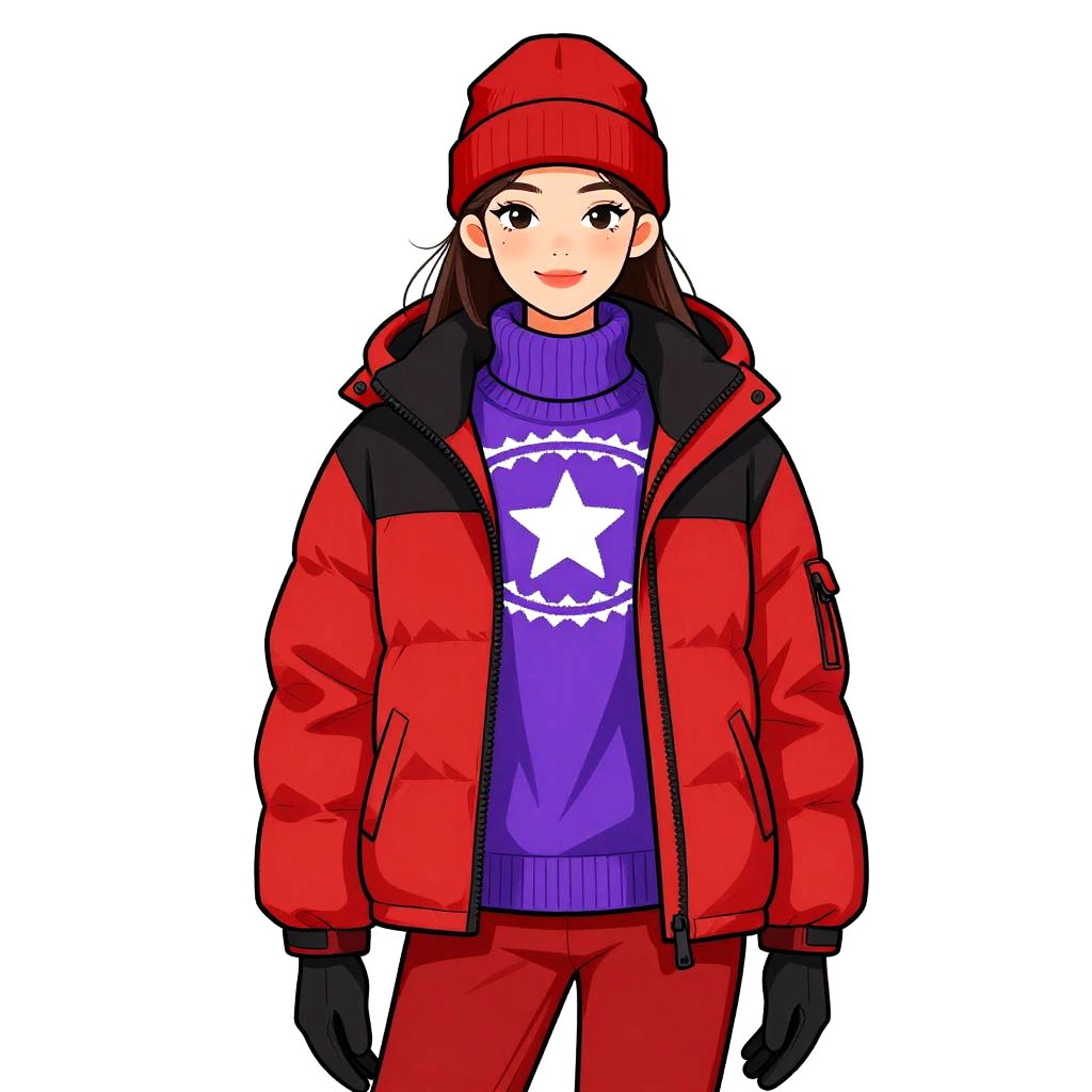 Woman with pretty face and pretty hair. smiling Woman, streetwear, oversized puffer jacket in bold pink and red color block, high collar, hooded, wide quilted panels, matching fitted beanie, red trousers, straight cut, plain white background. --sref 1467