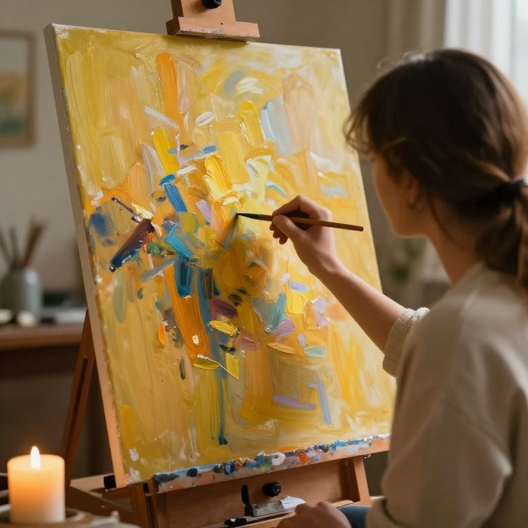 Photograph of a woman with brown hair painting abstract art on a canvas with yellow and blue brushstrokes, holding a brush, near a lit candle