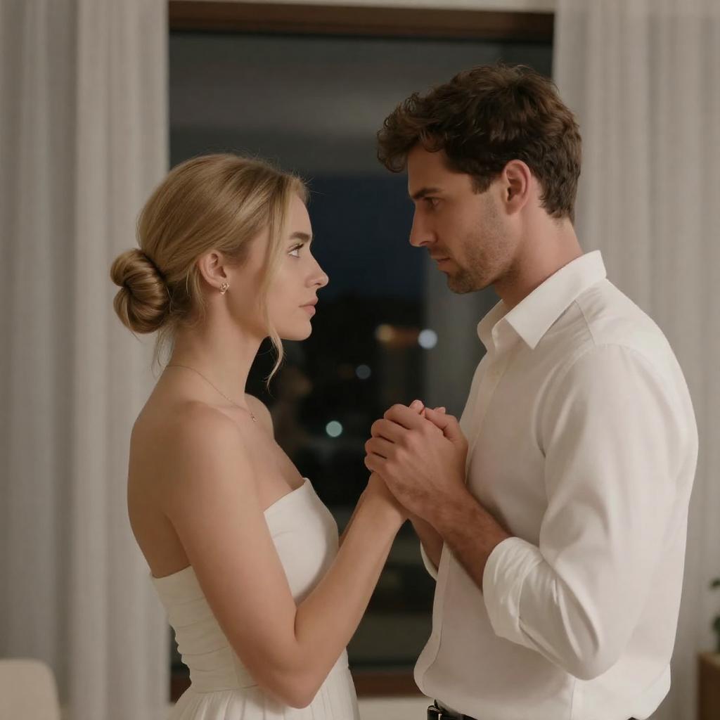 Photograph of a romantic scene. A man with dark, slightly messy hair in a brown suit stands close to a blonde woman with wavy hair in a red dress. She has her eyes closed, lips slightly parted. Background features blurred golden bokeh lights. Both figures are in a close, intimate embrace. The man has a gentle smile, focused on the woman. Warm, soft lighting. Bokeh lights create a festive, elegant atmosphere.
