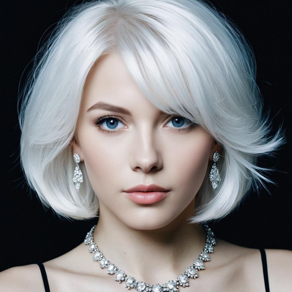 Close-up portrait of a young woman with bright red short hair, green eyes, and flawless fair skin. She wears red lipstick, red drop earrings, a pearl necklace, and a red short-sleeve shirt, posing against a green background while looking directly at the camera.