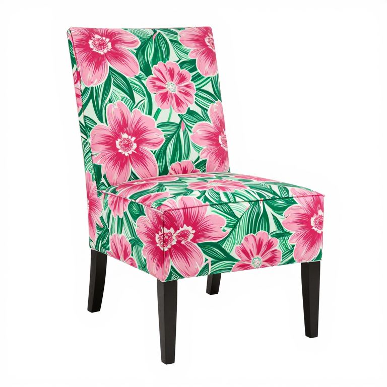 Vibrant floral chintz-patterned chair by Eileen & Taylor, featuring bold pink and green hues inspired by Lilly Pulitzer, showcased against a clean white background.