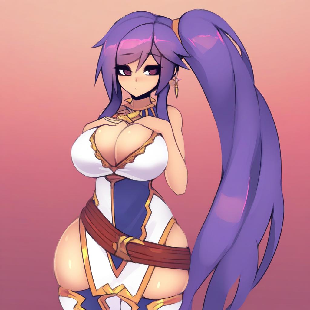 Ishtar (fire emblem), fire emblem, 1girl, purple eyes, purple hair, long hair, very long hair, ponytail, side ponytail, large breasts, cleavage, thighs, earrings, by artist sub-res, leet