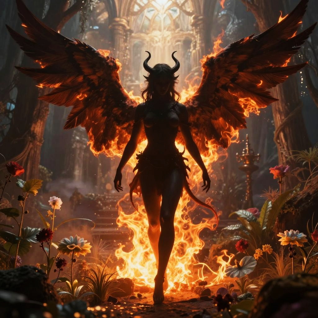 Digital art of a silhouetted, winged demon with horns standing amidst fiery flames in a dark, floral-laden, gothic cathedral.