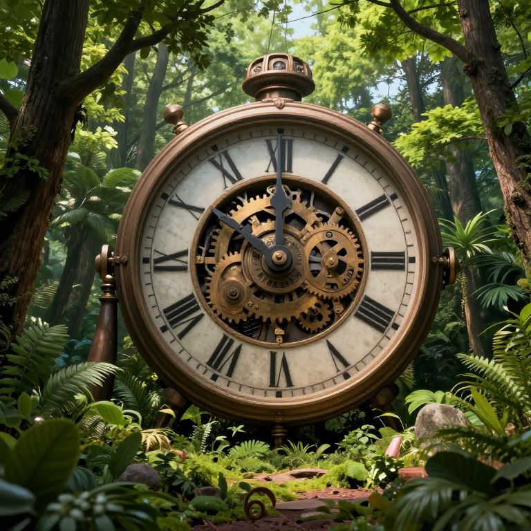 Envision a surreal digital landscape where an immense clock dominates a thriving forest, its pendulum gracefully cutting through the vibrant foliage with calculated ease. This fantastical scene merges the organic world with the mechanical, suggesting an ancient and sentient machine has enveloped nature within its gears. From a diminutive perspective, the intricate relationship between the colossal timepiece and the verdant environment is revealed, captivating the viewer with its enigmatic blend of technology and natural beauty in this dreamlike realm that defies the separation of reality and fantasy.