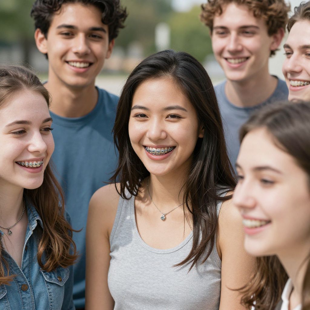 Braces filter overlay on a group of diverse young adults laughing outdoors, emphasis on detailed metallic dental braces, bright daylight with natural shadows, hyperrealistic style with a cheerful atmosphere.