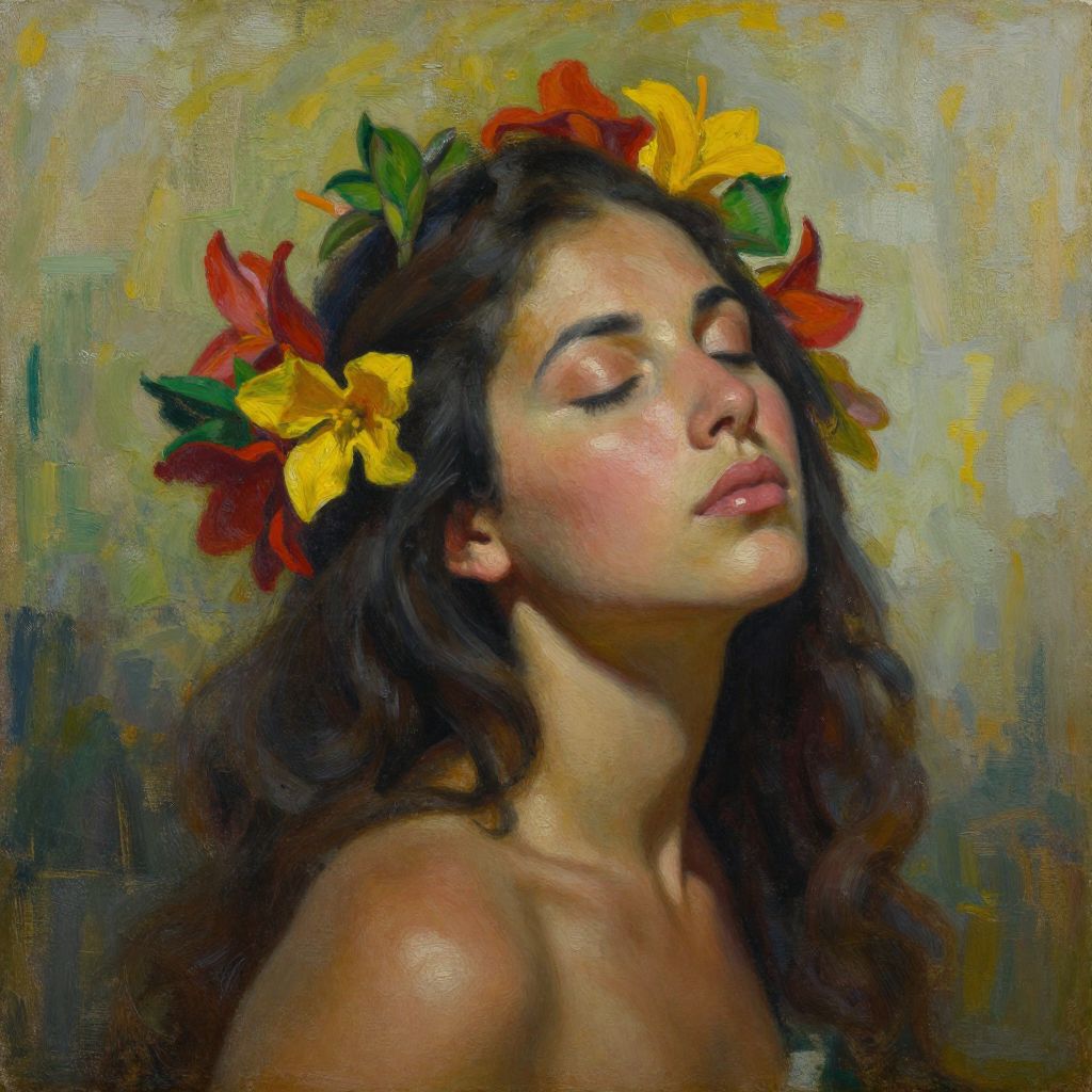 This is a digital painting of a young woman with long, wavy, dark brown hair, adorned with a floral crown featuring vibrant yellow and red lilies with green leaves. Her eyes are closed, and her expression is serene and slightly sensual. She has fair skin with a slight blush on her cheeks, and her lips are full and pink. She is bare-shouldered, implying nudity. The background is an abstract mix of green, yellow, and brown brushstrokes, adding depth and contrast to the subject. The painting style is realistic with a touch of impressionism, focusing on vivid colors and soft textures.