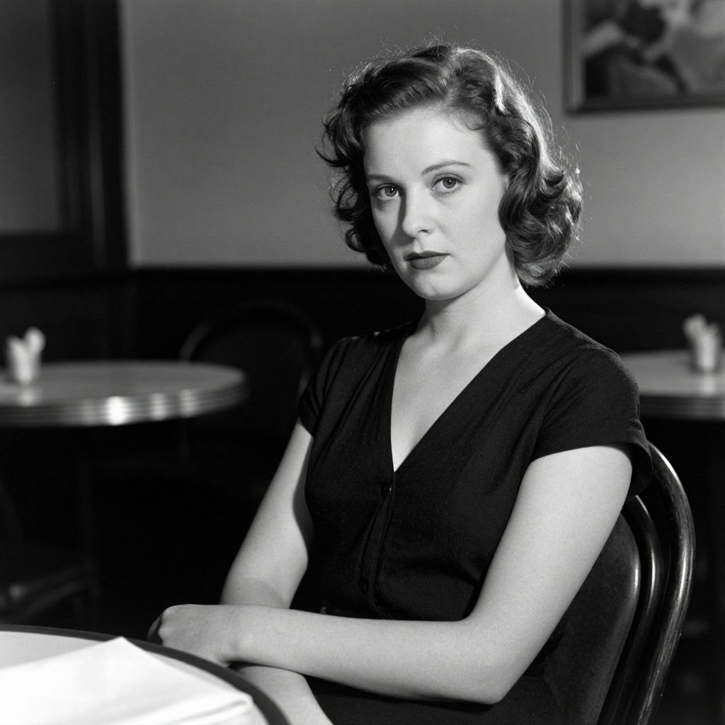 A vintage black-and-white photograph captures a woman seated in a classic café, exuding a timeless elegance reminiscent of Lotte Laserstein's 1930s portraiture, with dramatic lighting accentuating her poised demeanor and the retro ambiance of the setting.