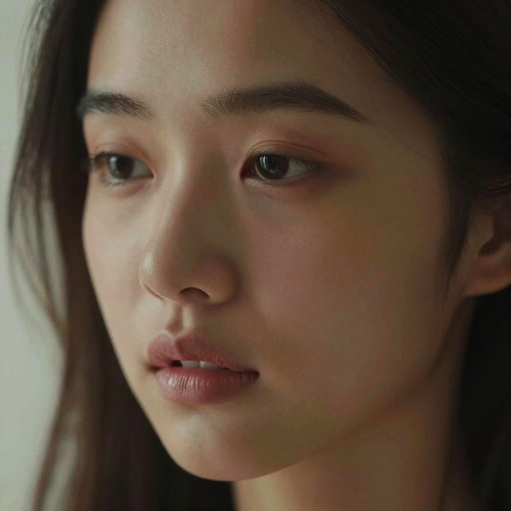 Close-up photograph of a young Asian woman with fair skin, long dark hair, and neutral expression, soft lighting highlighting her natural features.