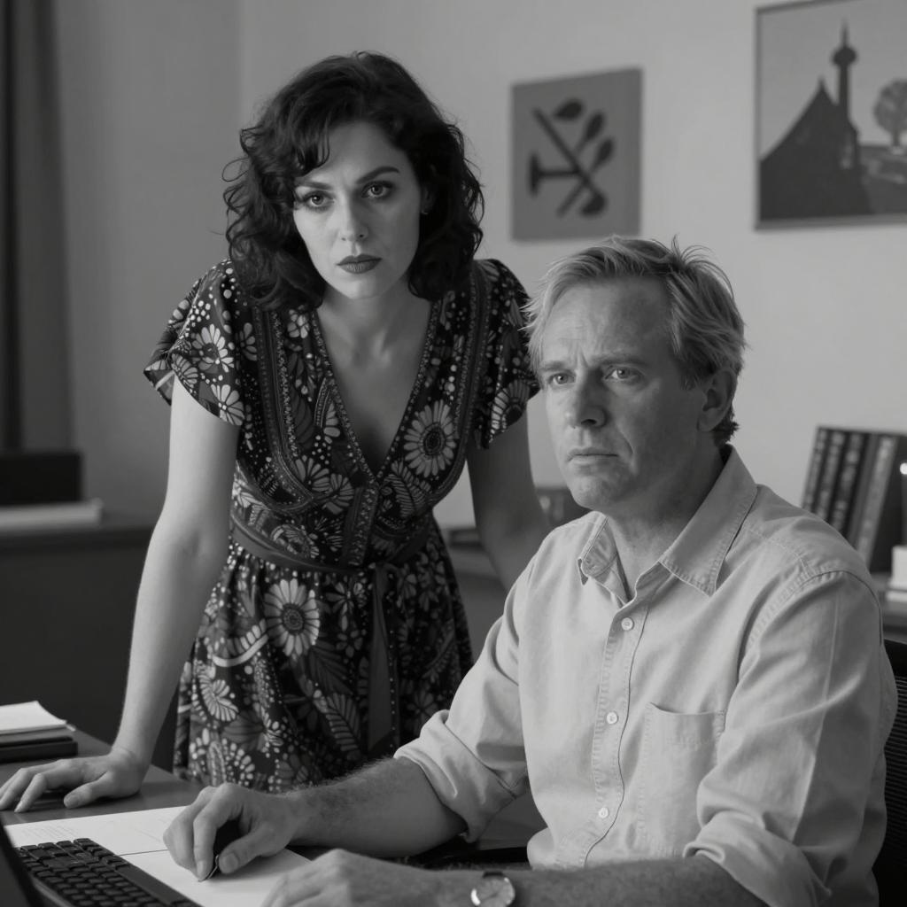 Black-and-white photograph of a man and woman sitting at a table. Man in dark suit, holding a bottle, smiling. Woman in striped dress, short hair, looking at man. Four bottles on table, lamp in background. Man on left, woman on right.