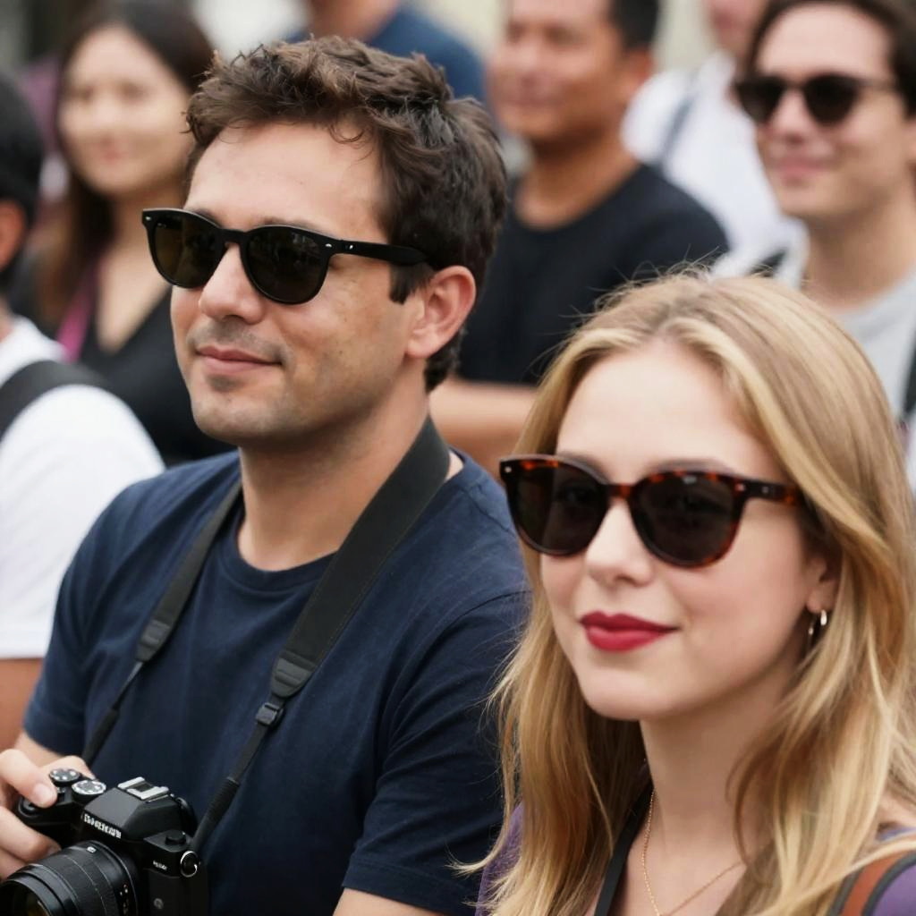 Photograph of a man and woman in the foreground, both wearing sunglasses. The man has dark hair, the woman has blonde hair and red lipstick. Background shows a group of people, some smiling. The man holds a camera in his left hand.