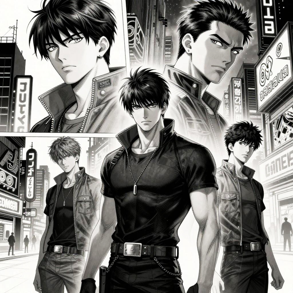 A high-contrast AI manga generator free concept art of a cyberpunk cityscape with manga-style protagonists, neon signs, and detailed backgrounds blending traditional manga aesthetics with futuristic AI enhancements.