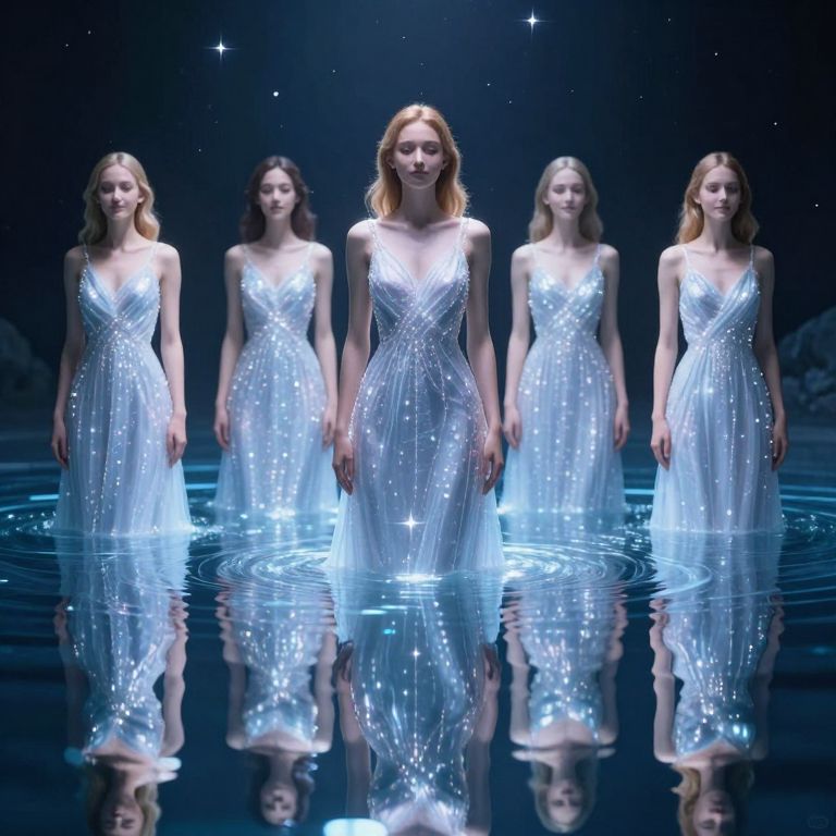 Digital art depicting five identical women standing in a shimmering pool of liquid starlight at night. The women wear sparkling translucent white dresses and pose in perfect symmetrical formation, their reflections visible in the water below. The scene is ethereal and surreal, illuminated by stars and soft blue lighting.
