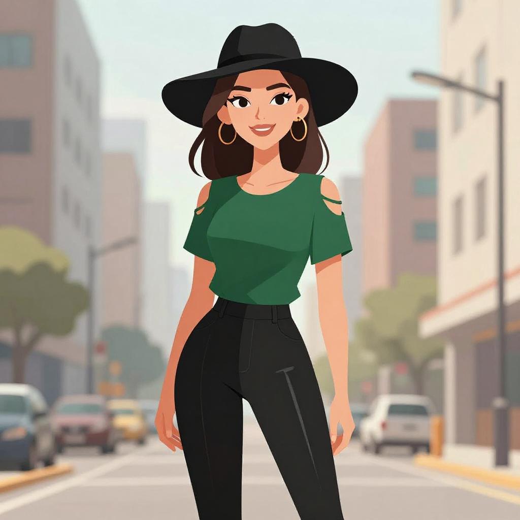 Woman with pretty face and pretty hair. smiling Woman, modern urban, dark green blouse with lattice shoulder cutouts, short sleeves, black faux leather pants, skinny fit, high-waisted, wide-brimmed black floppy hat. --sref 1467