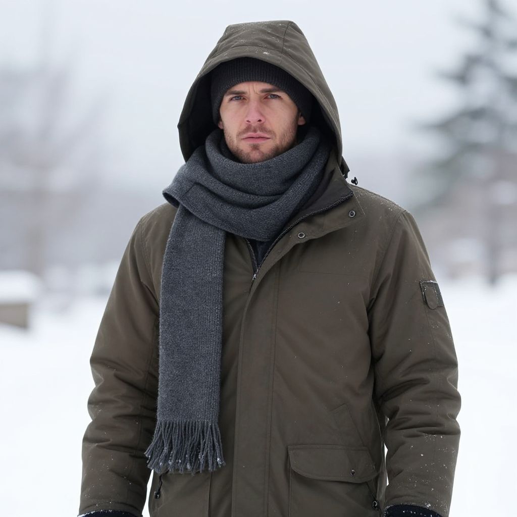 Photograph of a bearded man standing in a snowy outdoor setting. He wears a dark green hooded parka with a large, thick, gray knitted scarf wrapped around his neck and face. His hands are in his pockets, and snowflakes are visible on his coat. The background is blurred, featuring a white, snowy landscape with indistinct, out-of-focus trees. The man's expression is serious, with a slight frown, and he gazes directly at the camera. The overall color palette is muted, dominated by greens, grays, and whites.