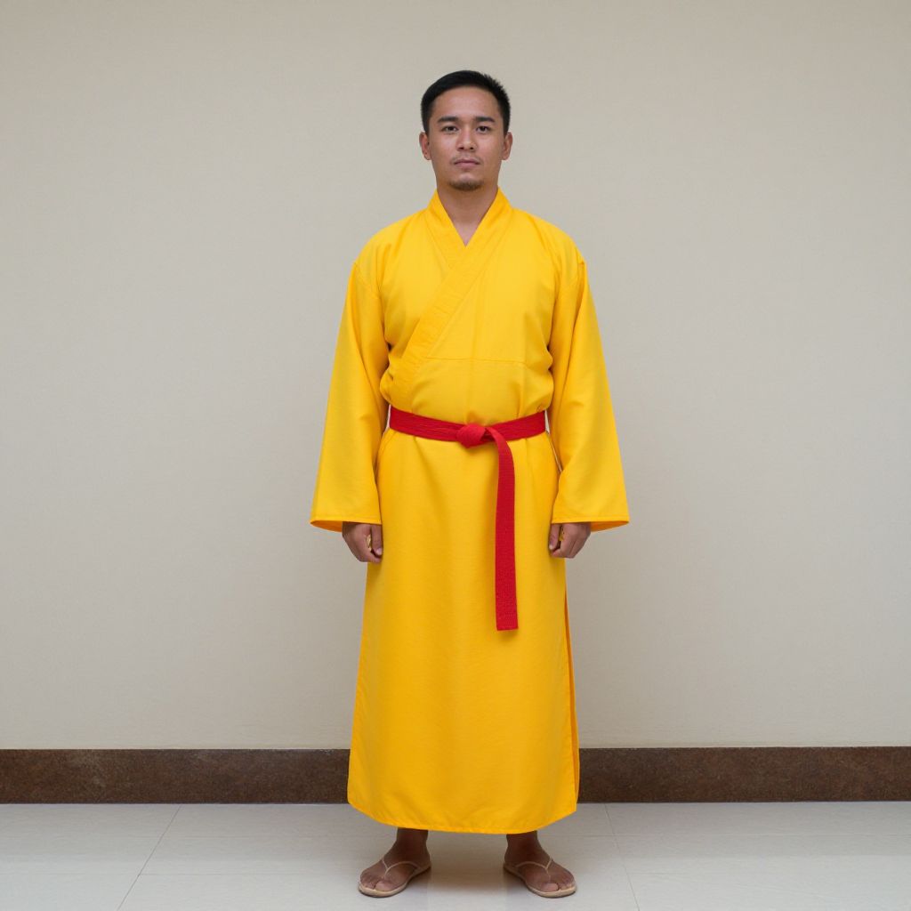 "Teej Outfit, man in a yellow robe and red belt standing in front of a wall"
