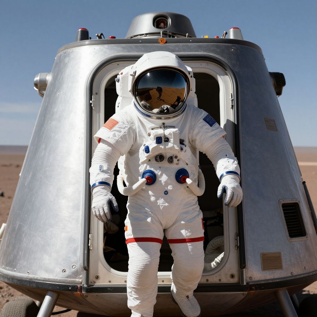 Photograph of an astronaut in a white spacesuit with red stripes, standing in the open hatch of a silver, dome-shaped spacecraft on a barren,