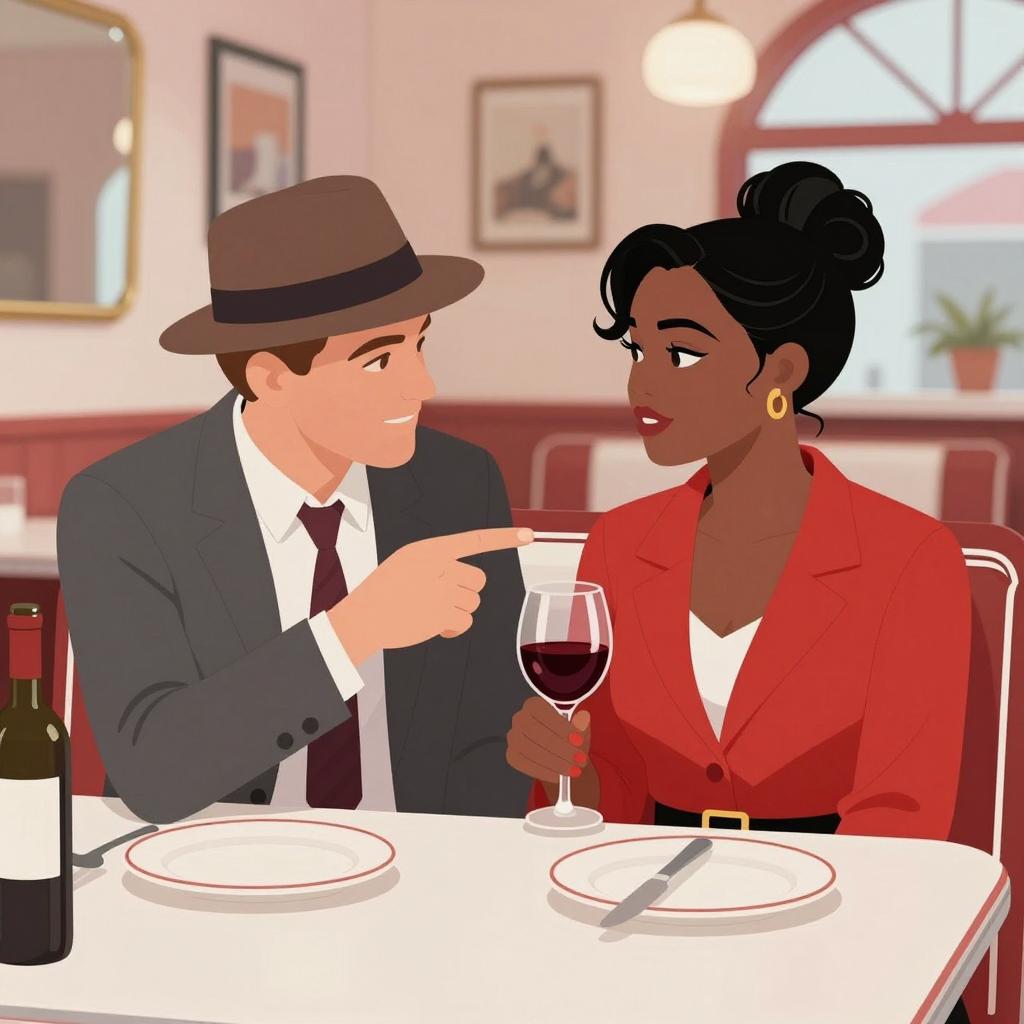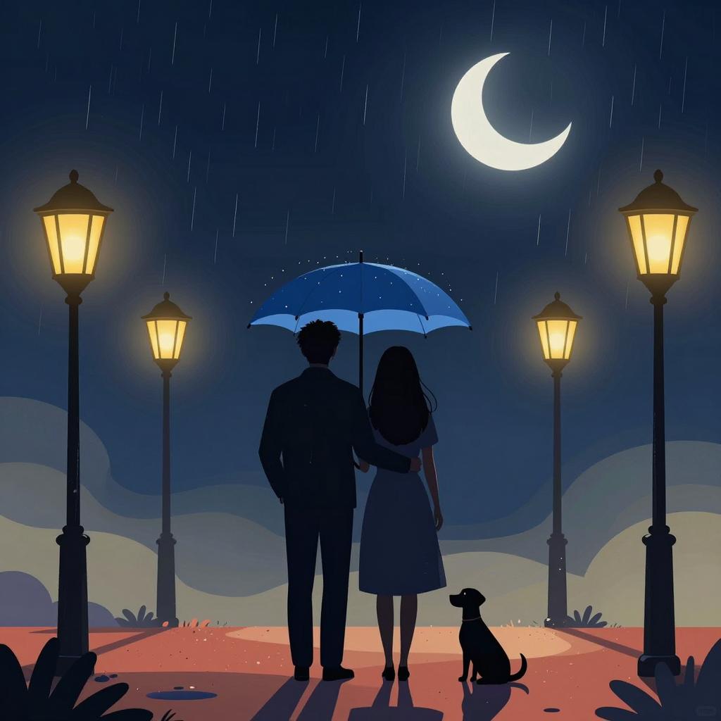 Illustration of a slim woman with long black hair, wearing a white trench coat and white high heels, leaning against a lamp post. A silhouette of a man in a suit stands to the right. Background includes a lit window with blurred figures and streetlights. Bright, glowing orbs in the foreground. Digital art style.