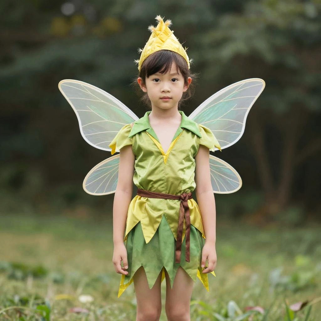 Peter Pan Fairy Costume, young girl dressed in green and yellow with a fairy costume