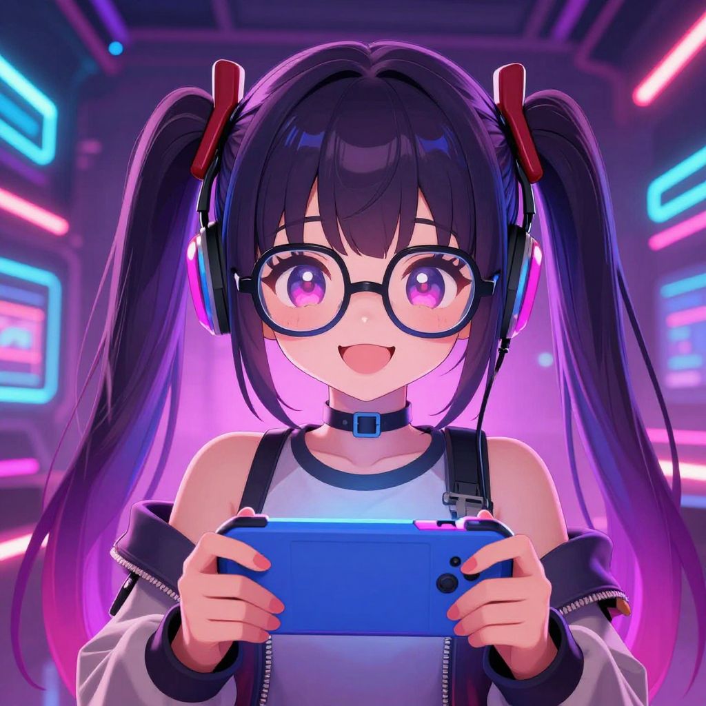 Cute anime gamer girl with twin tails and large glasses, bright smile, vibrant cyberpunk background, detailed character design, high contrast neon lights, holding a handheld console