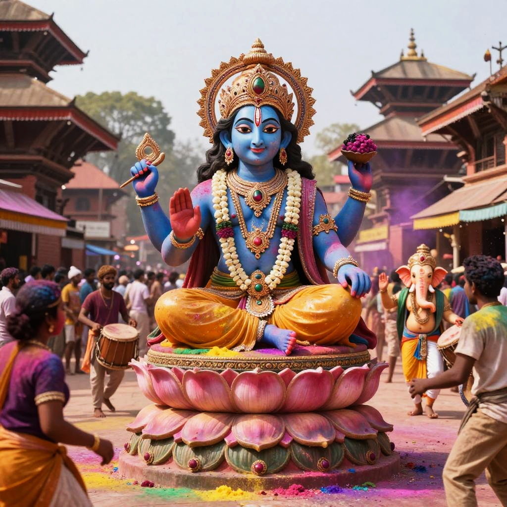 A surreal, dreamlike festival flickering where a bustling Kathmandu festival square during Holi forms the background. A joyous and vibrant Krishna deity, seated on a lotus throne, resplendent with a grand, cropped crown and opulent royal jewelry, cascading down. A vibrant 3D scene of a Lord Ganesha festival celebration with colored powders, dancers, drums, creating a colorful explosion, 8k artistic photography, photorealistic concept art, soft natural volumetric cinematic perfect light, cinematic, hyper realism, high detail, octane render