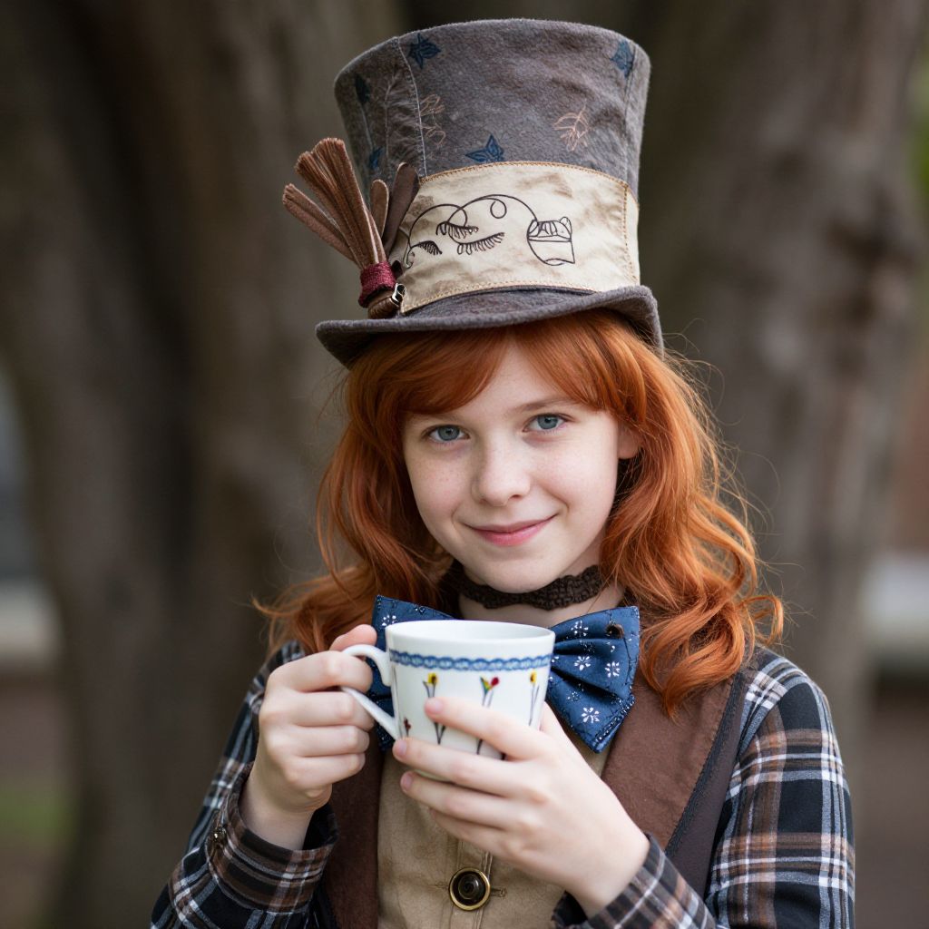 Mad Hatter Costume Boy, young girl with bright red hair wearing a hat and holding a cup