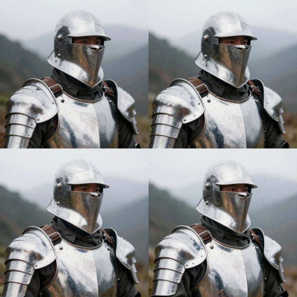 Photograph of a knight in shiny silver plate armor with a reflective helmet, standing outdoors against a blurred mountainous background. Four identical close-up images arranged