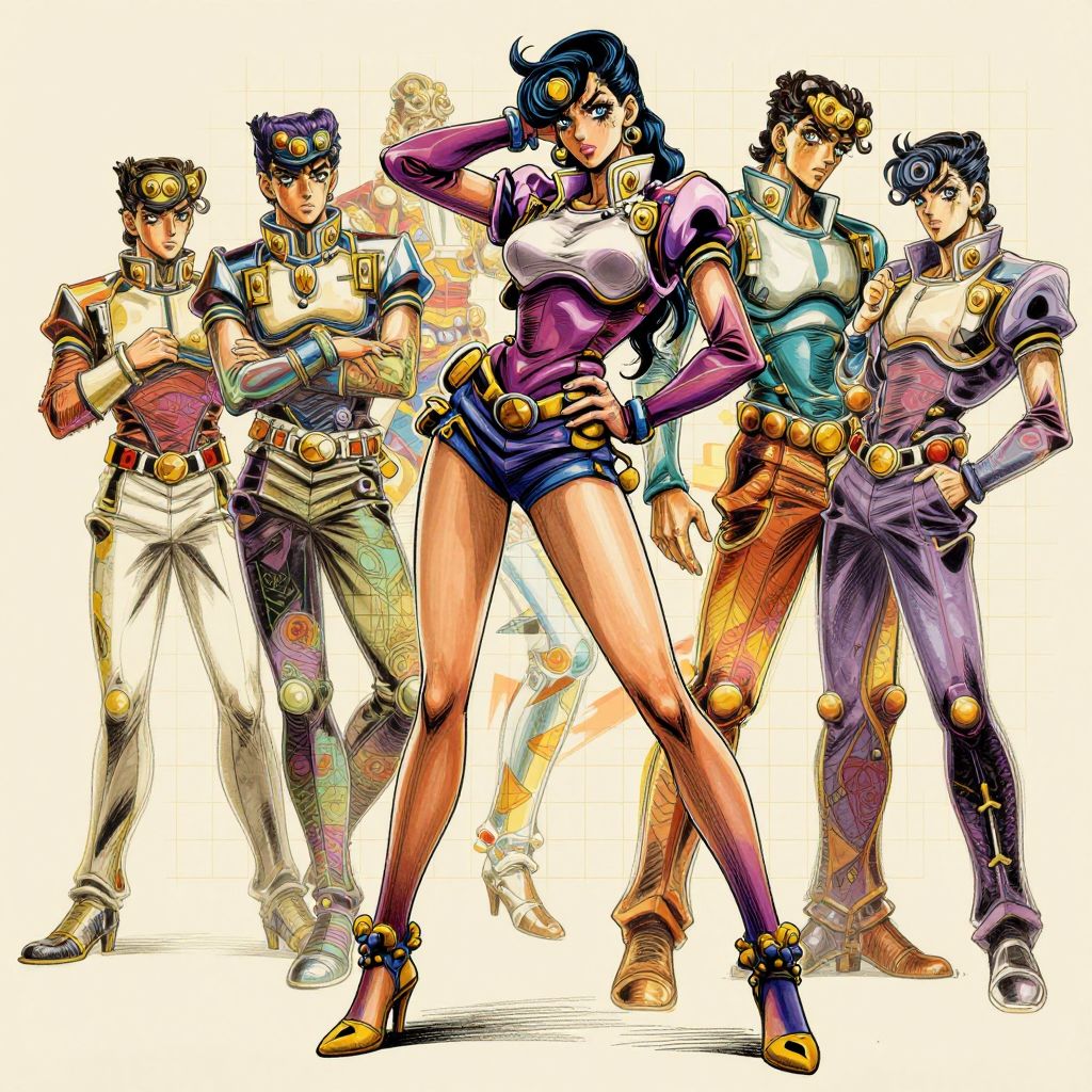 Inksketch, FFAIM, A slender, long-legged Japanese woman adopts an unusual, eccentric pose reminiscent of the iconic poses of characters from Hirohiko Araki famous manga JoJo's Bizarre Adventure, Her pose demonstrates the model's boldness and confidence, exaggerated angles and dynamic artistic taste, The image conveys the model's elegance and uniqueness by combining fashion and anime aesthetics, making it both vibrant and avant-garde, The beige background is filled with a holographic grid of patterned figures, drawn in warm colors, with an autumnal atmosphere