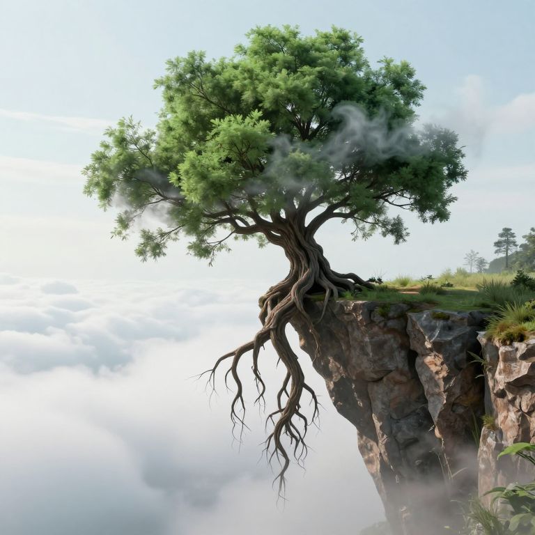 A surreal 3D-rendered scene depicts a majestic, inverted tree perched precariously on the edge of a cliff, its roots sprawling downward into the misty clouds below, while its lush green foliage dissolves into ethereal smoke as it meets the gentle breeze, creating a dreamlike, otherworldly atmosphere.