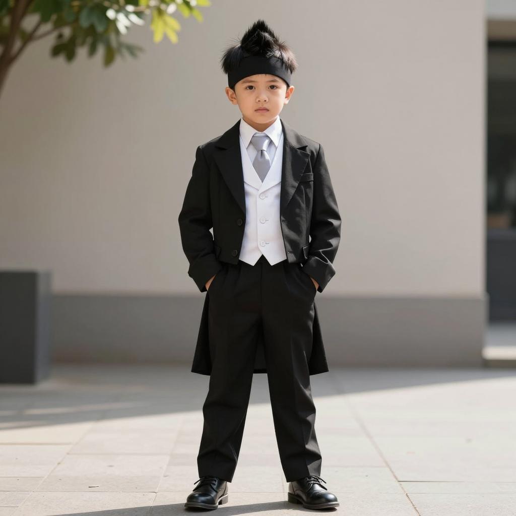 Portrait of an adorable baby boy standing indoors wearing an ornate traditional outfit in gold with black trim. The child is wearing a matching black and gold hat with intricate designs and a black belt, complemented by black shoes. The setting features a light brown wooden floor and a white door background, with natural sunlight casting soft shadows. The baby has a focused expression, creating a detailed and realistic image with soft lighting and a neutral background.