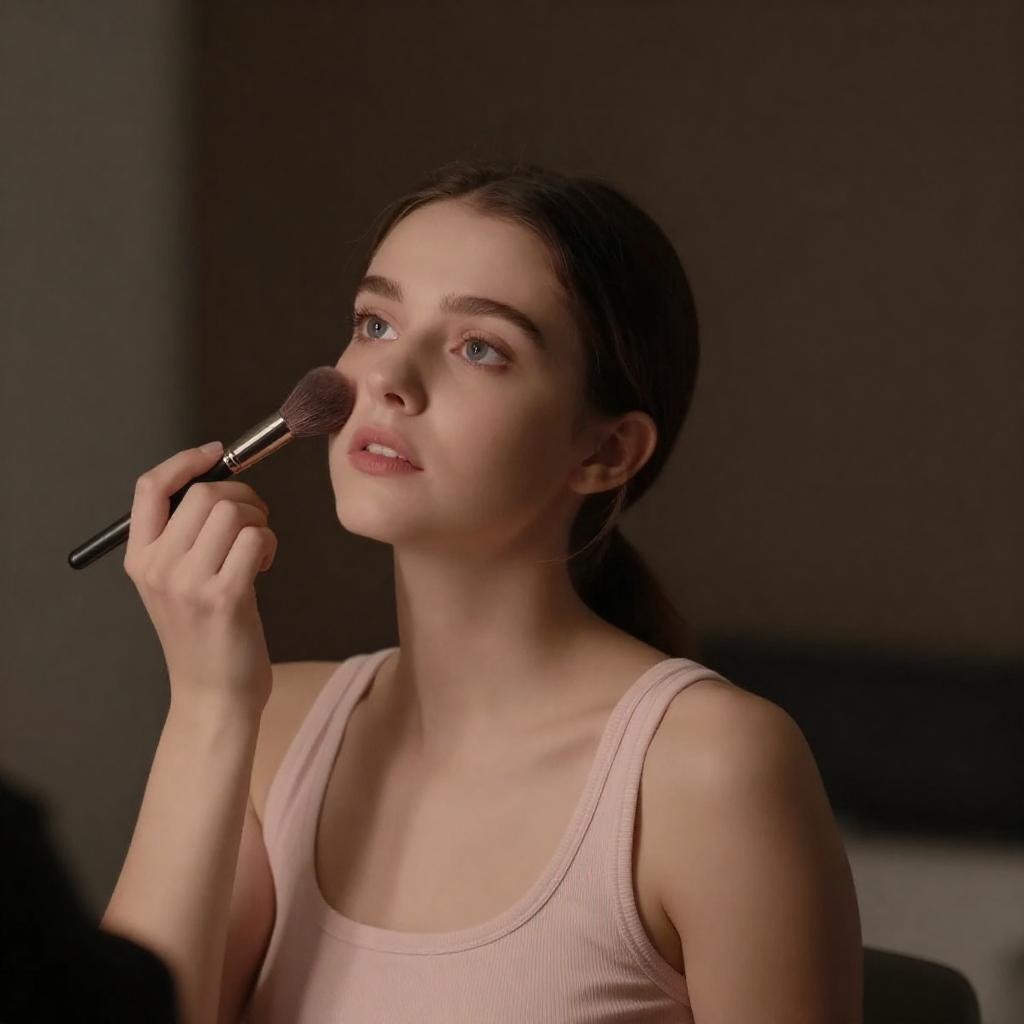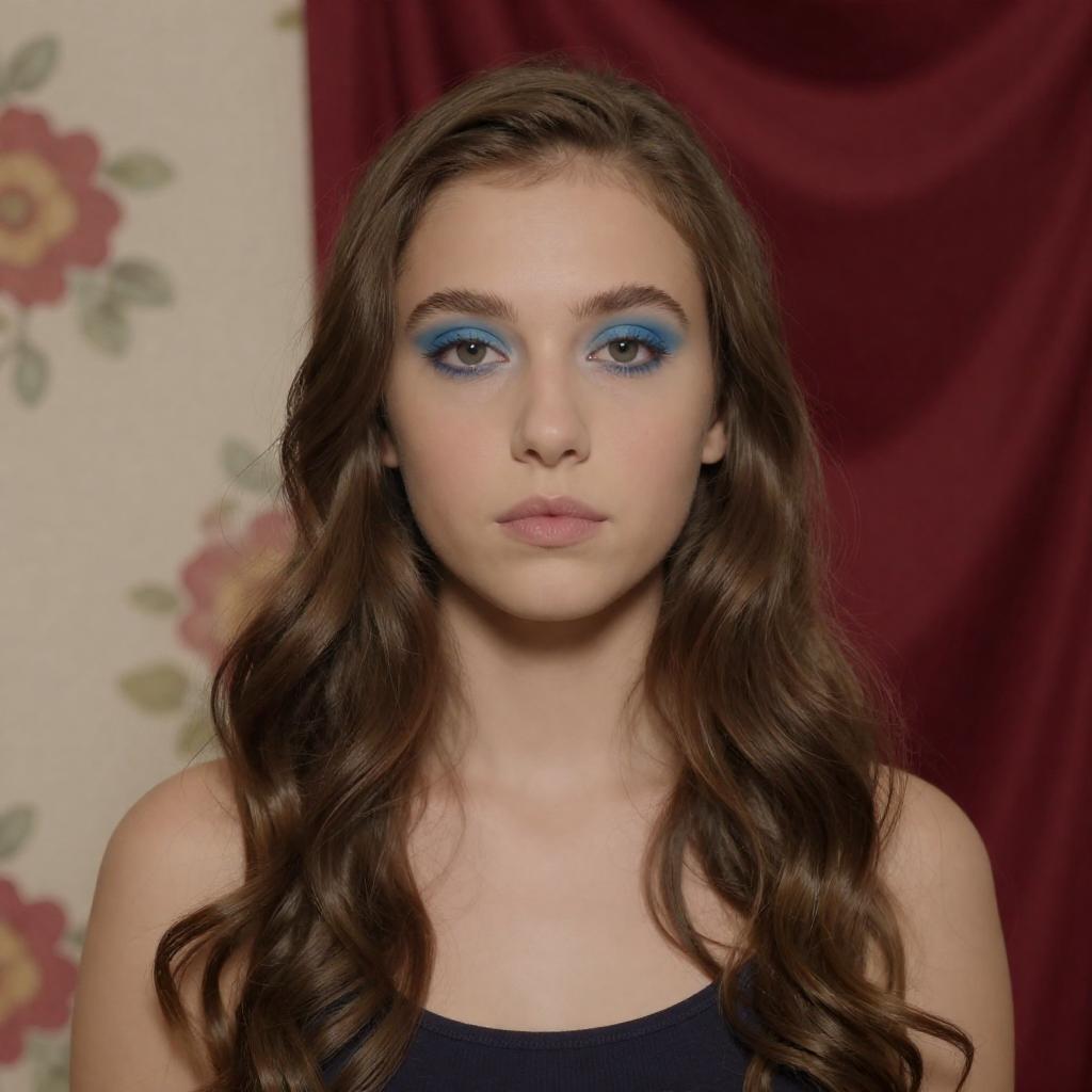 Photograph of a young woman with long, wavy brown hair, blue eyeshadow, and natural makeup. She has a neutral expression, wearing a dark tank top. Background features a floral-patterned wall and a red draped fabric. Centered in the frame.