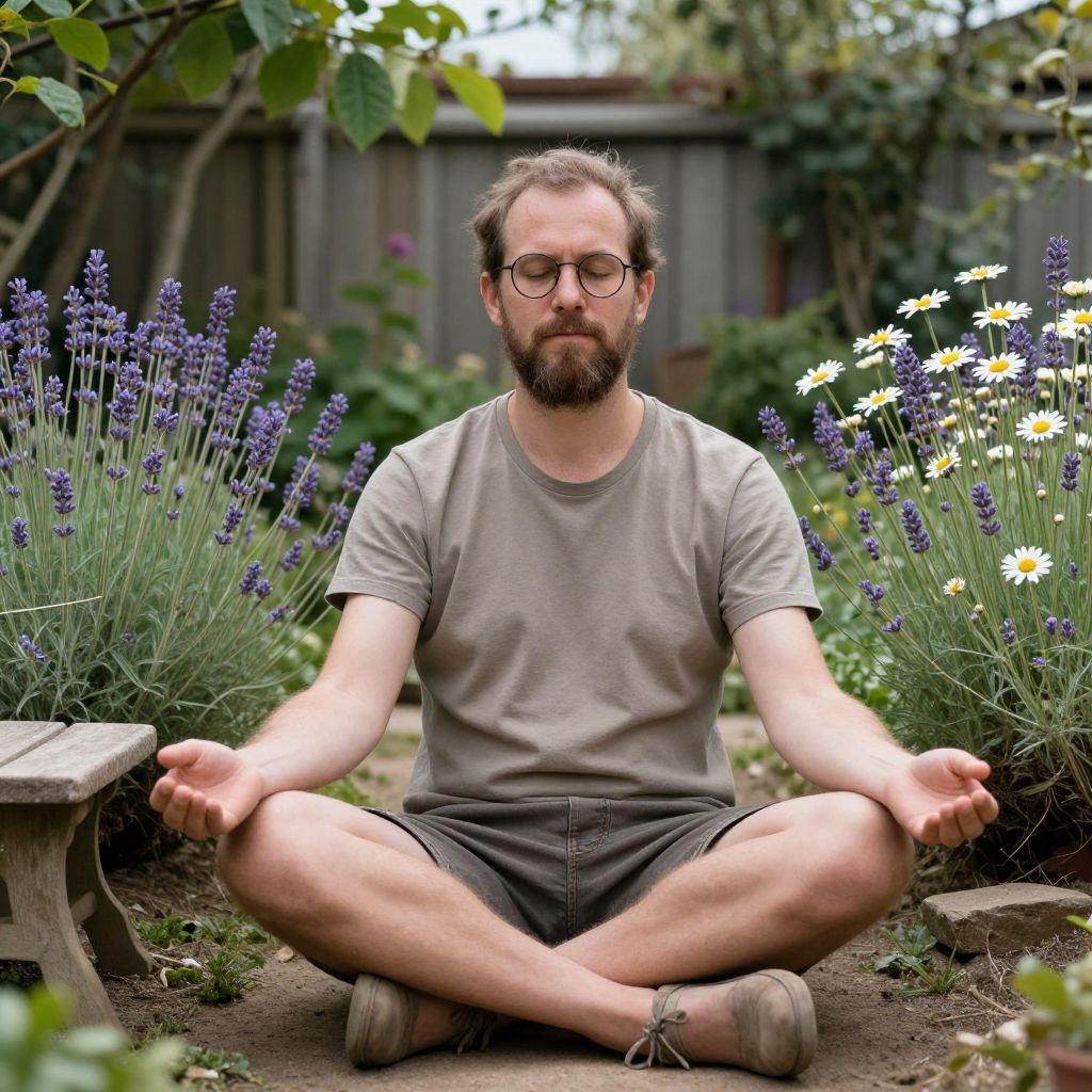 A man with kind facial features, a slightly rugged beard, and glasses sits cross-legged in a rustic backyard garden, arms resting on his knees in a calming garden pose, surrounded by lavender and daisies. The scene is peaceful, with a breeze gently moving the leaves and a small wooden bench nearby.