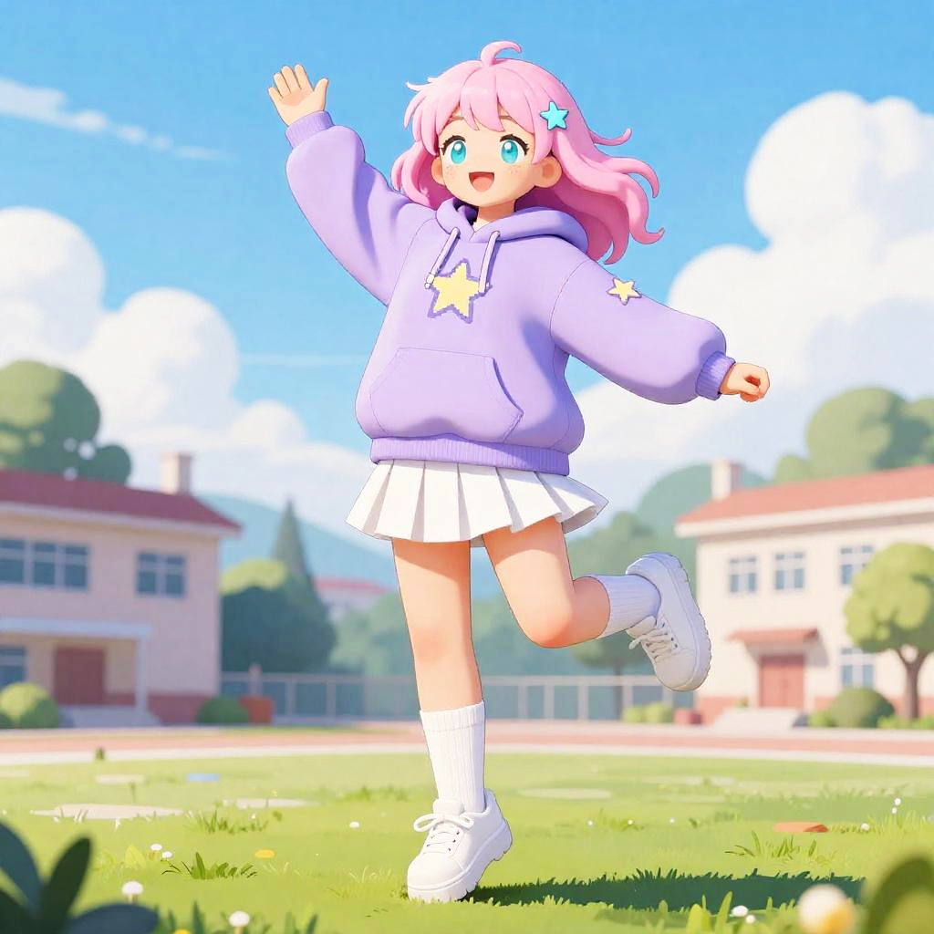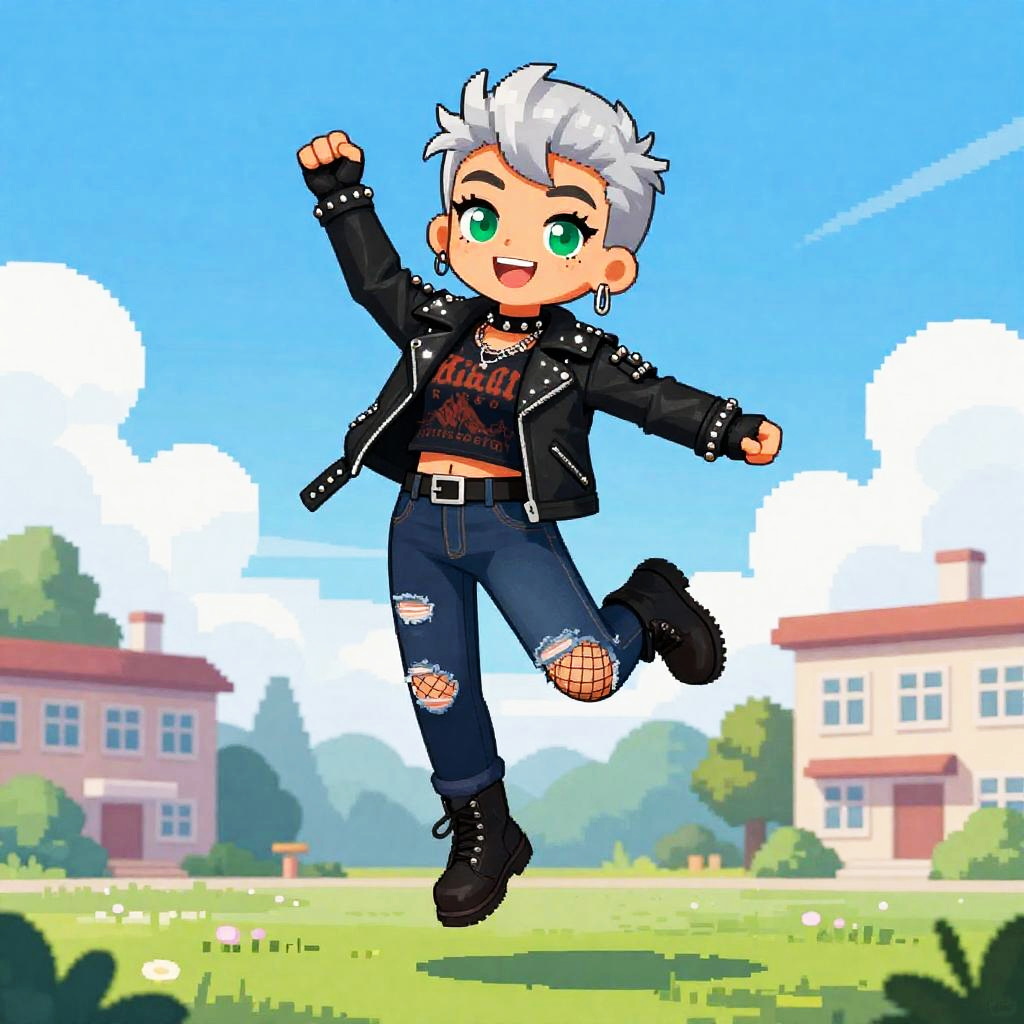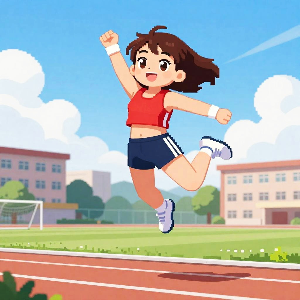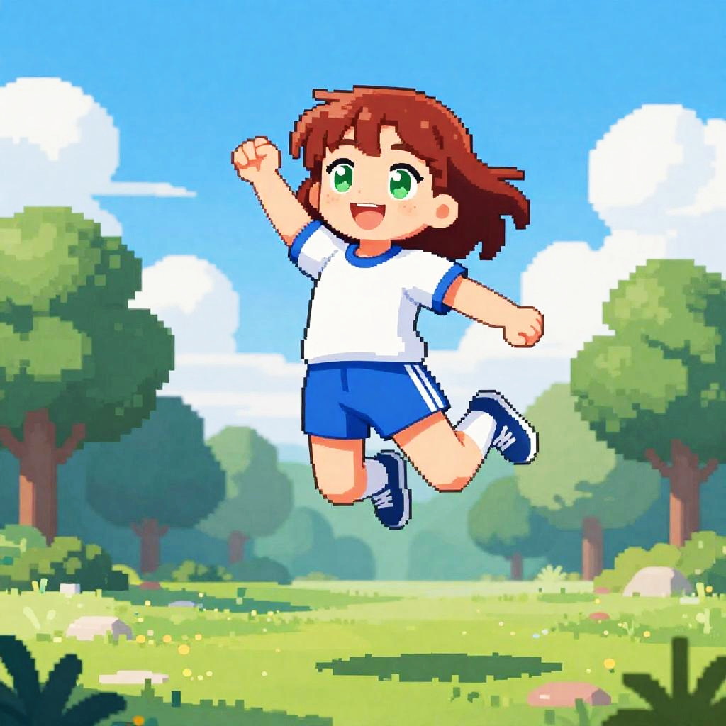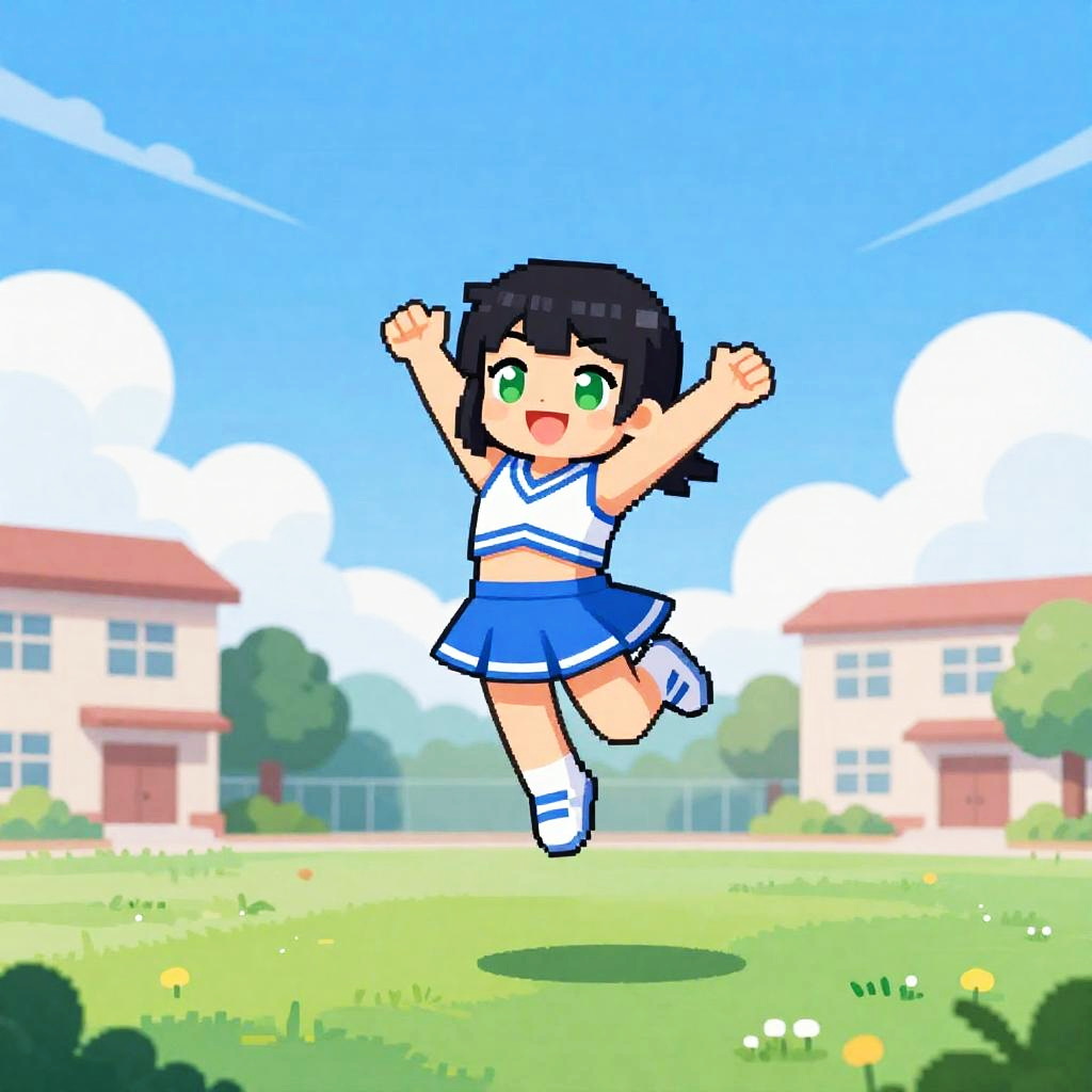 1girl schoolgirl (navy blazer, white blouse, red ribbon tie, pleated grey skirt, knee-high navy socks, brown loafers, satchel) jumping happy, (PixelArt:1), brown eyes & jet-black hair in twin braids with soft bangs, light makeup, round glasses, warm skin tone, curvy, looking at viewer, smile, :D, jumping, cute pose, (detailed landscape, school, grass, clouds:1.2), (background:1), (dynamic_angle:1.2), (dynamic_pose:1.2), (rule of third_composition:1.3), (dynamic_perspective:1.2), (dynamic_Line_of_action:1.2), solo, wide shot, (masterpiece:1.2), (best quality, highest quality), (ultra detailed), (8k, 4k, intricate), (full-body-shot:1), (Cowboy-shot:1.2), (50mm), (highly detailed:1.2), (detailed face:1.2), detailed_eyes, (gradients), (ambient light:1.3), (cinematic composition:1.3), (HDR:1), Accent Lighting, extremely detailed, original, highres, (perfect_anatomy:1.2)